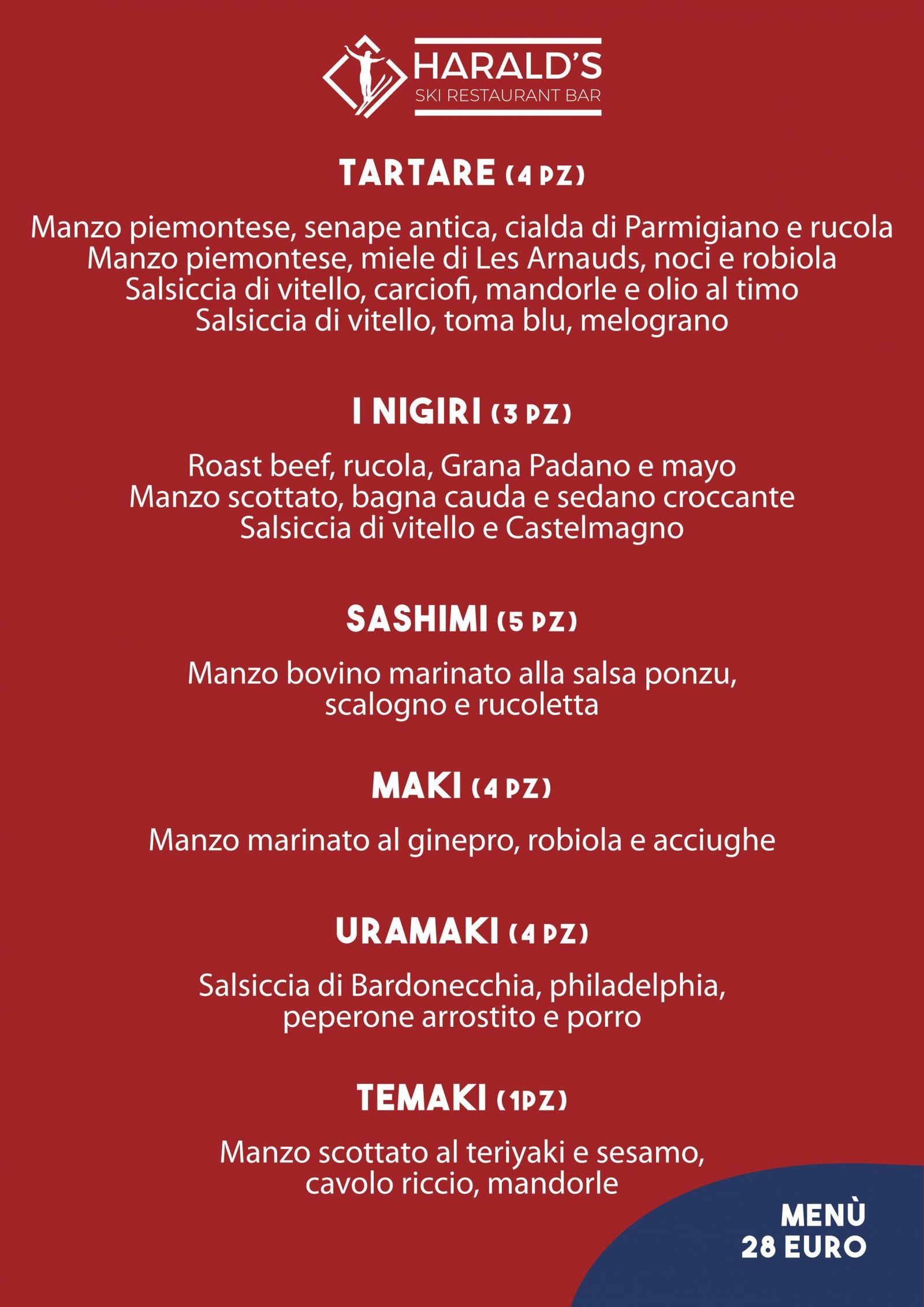 Ad aprire il sipario è il “Gunkan”, con manzo, senape antica e porro stufato, per poi proseguire con gli iconici “Nigiri”: da “Il tonnato”, con vitello cotto al punto rosa, salsa tonnata ‘900 e fiore di cappero, a “La bagna cauda”, con manzo scottato, bagna cauda e sedano croccante, fino a “La Bra”, con salsiccia di vitello e castelmagno. L’esperienza gastronomica continua con gli immancabili “Maki”, con manzo marinato al ginepro, robiola e chips di topinambur, fino agli irresistibili “Uramaki”, con vitello scottato, philadelphia, peperone arrostito e acciuga. A chiudere questa serie di invitanti proposte salate a tema asiatico è il Temaki, con salsiccia di Bardonecchia, cavolo riccio e nocciole. Il ristorante Harald’s conclude il menù in dolcezza con la deliziosa Cheesecake al mango con scagliette di cioccolato. È disponibile anche il servizio d’asporto e di consegna a domicilio. Per le prenotazioni o per ricevere maggiori informazioni contattare il numero telefonico 0122 99002.