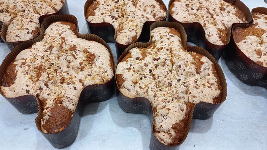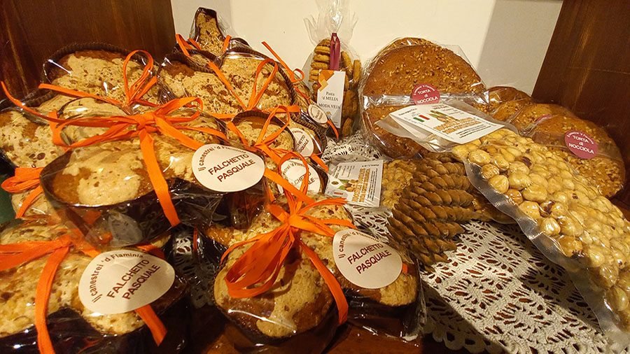 Anche quest’anno il noto biscottificio condovese di Katya e Paolo ha sfornato il Falchetto Pasquale. L’impasto del Falchetto Pasquale de “Ij Canestrei ‘d Flaminia” è come quello della torta di nocciole. Contiene la scorza di arancia candita in parte tritata nell’impasto, in parte a cubetti. È gustosamente consistente ed è diverso dall’impasto della colomba classica. Non prevede lunghi tempi di lievitazione e ingloba ben un terzo di nocciole, farina 00, uova, burro, zucchero, latte, miele di acacia, olio di oliva e lievito. Il tutto ricoperto da una golosissima glassa fatta di nocciole, mandorle e zucchero amalgamati all’albume. Paolo, mentre è intento a impastare i Falchetti Pasquali, ci racconta che la loro ricetta è ormai consolidata. Senza dimenticare che i Falchetti Pasquali sono ottimi se accompagnati dallo strepitoso zabaione che puoi trovare in bottega.