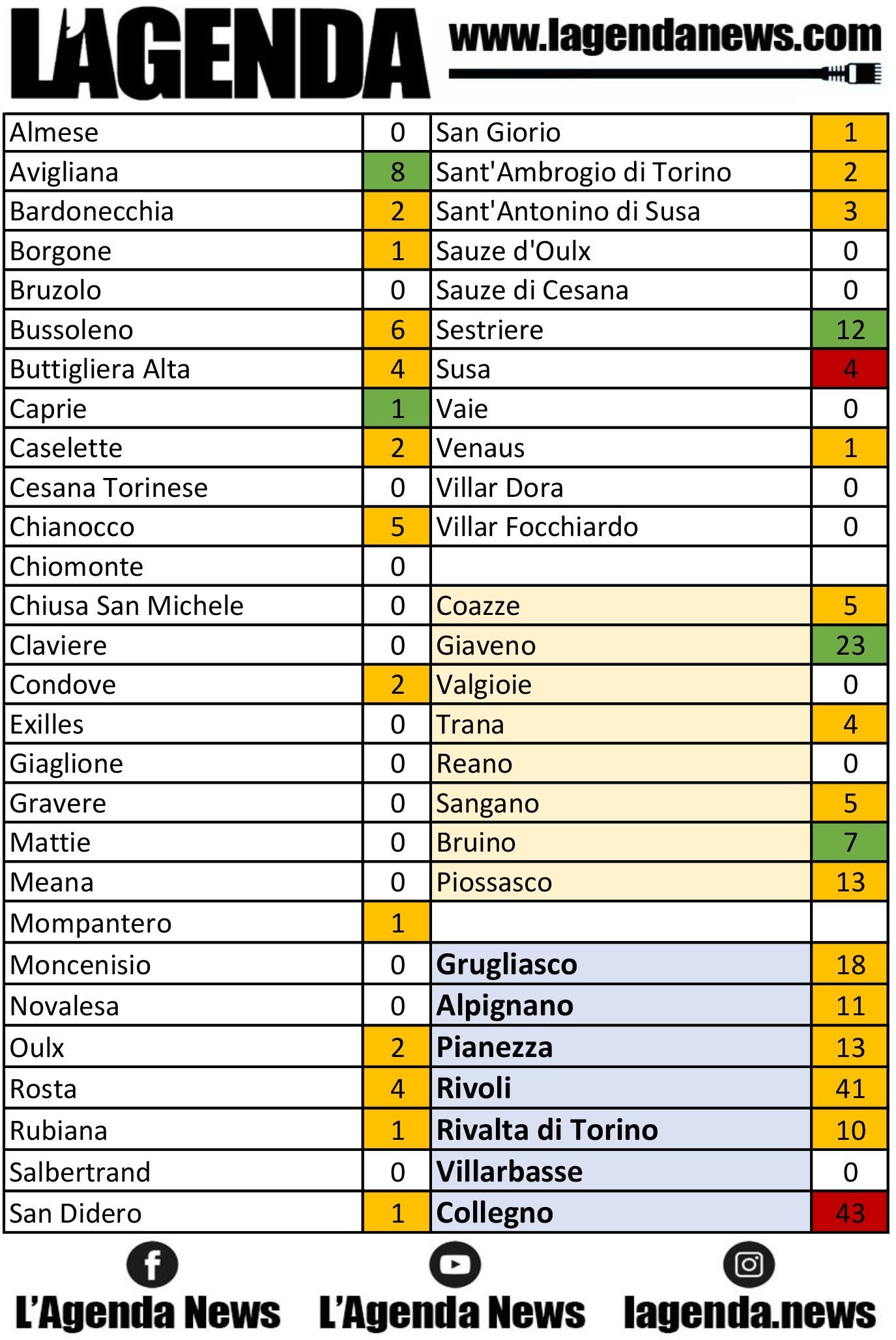 Aggiornamento Coronavirus: i dati diĀ Valsusa,Ā ValsangoneĀ eĀ Cintura Ovest Torino. Iscriviti alla nostra pagina FacebookĀ LāAgenda News: clicca āMi Piaceā e gestisci impostazioni e notifiche in modo da non perderti più nemmeno unaĀ notizia! Segui e metti mi piace al canale YouTubeĀ LāAgenda News.