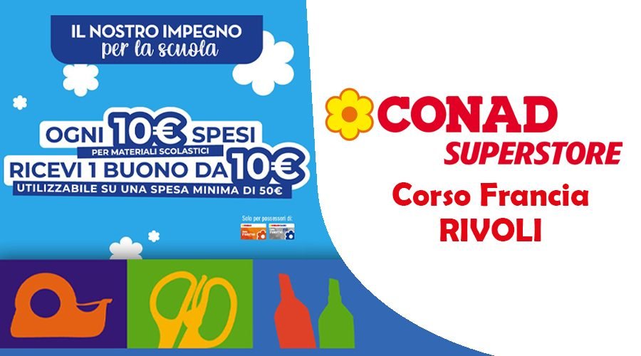 RIVOLI – Pronti per la campanella? Fino al 30 settembre, ogni 10€ spesi in materiale scolastico, al Conad Superstore di Corso Francia a Rivoli ricevi uno o più buoni da 10€! Potrai utilizzare ogni buono fino al 31 ottobre su una spesa minima di 50€ nello stesso punto vendita in cui ti è stato consegnato. L’iniziativa è valida per i possessori di Carta Insieme. Regolamento completo sul punto vendita. Inoltre se prenoti i libri scolastici da Spazio Conad di Corso Susa a Rivoli entro il 30 settembre: avrai uno sconto immediato del 15%! E se lo desideri, a pagamento, è disponibile il servizio di copertinatura: richiedila mentre ordini e ritira i libri già copertinati!