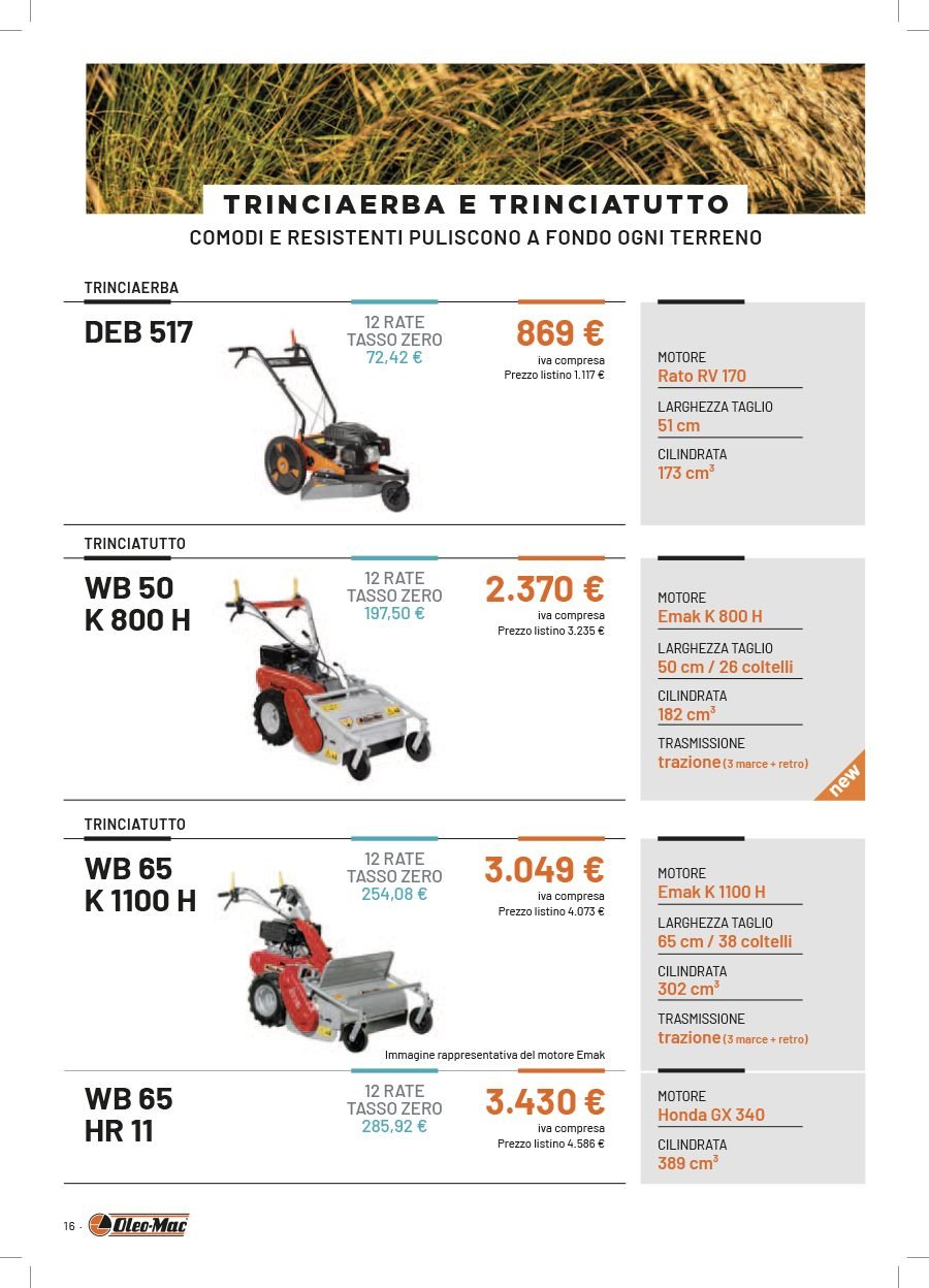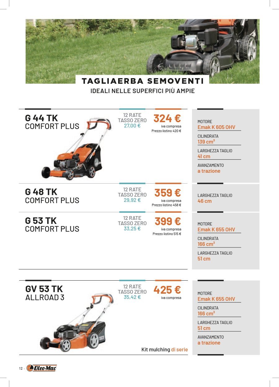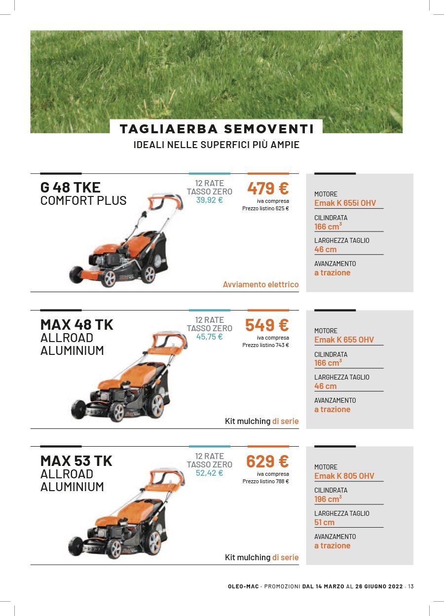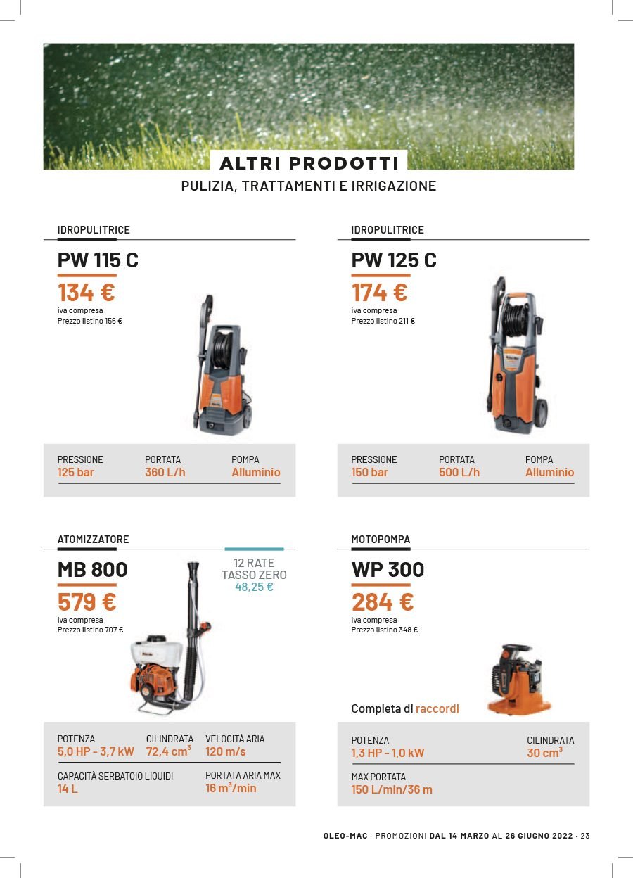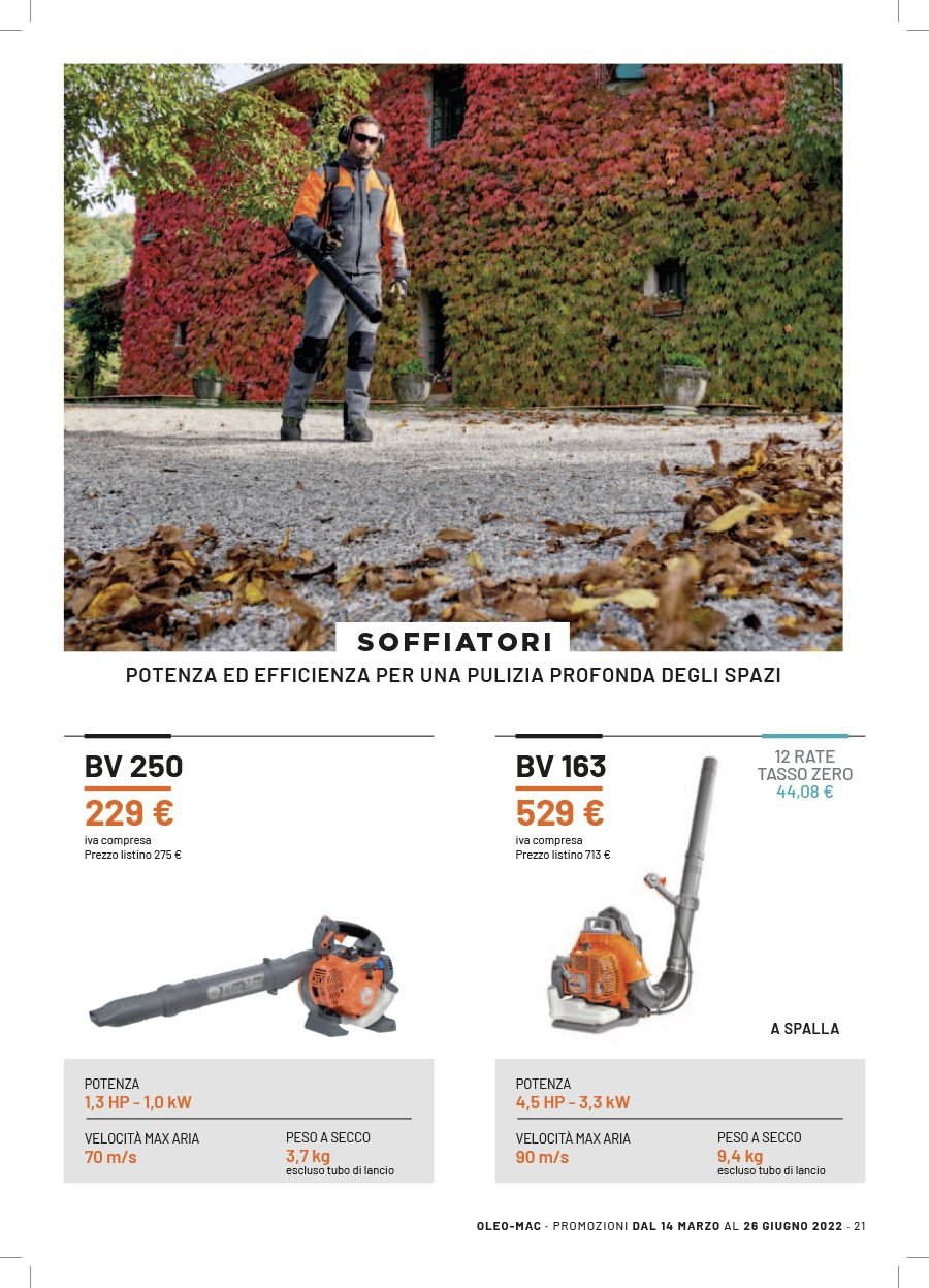 La Va.Ma. di Bussoleno ha unāampia scelta di macchine per soddisfare ogni esigenza. Tratta i prodottiĀ Oleo-Mac (il volantino al link) e Husqvarna (il volantino al link), aziende che rappresentano un punto di riferimento per professionisti e hobbysti nella manutenzione del verde. Inoltre ha scelto per la sua clientela la qualitĆ e lāaffidabilitĆ delĀ marchio italiano Nibbi. LaĀ Va.Ma.Ā si tiene costantemente aggiornata sulle ultime promozioni delle case trattate,Ā per proporre alla sua affezionata clientela le migliori offerte sul mercato. Sui volantini promozionali ĆØ possibile scegliere fra prodotti a batteria e non, tagliaerba a spinta e semoventi, soffiatori, tagliasiepi, motoseghe, potatori, decespugliatori e accessori collegati, trattorini, trinciaerba e trinciatutto, motozappe, motocarriole, idropulitrici, motopompe, abbigliamento da lavoro e molte altre attrezzature.