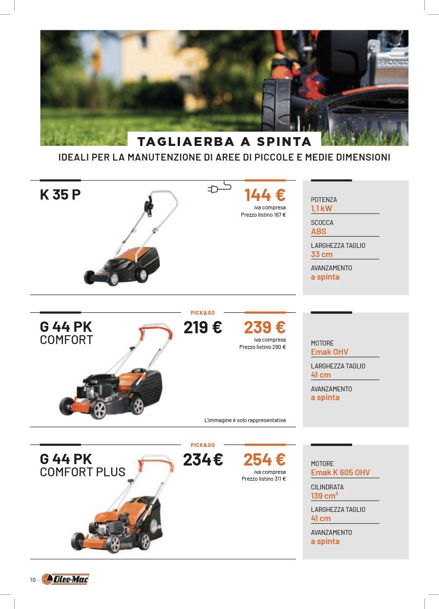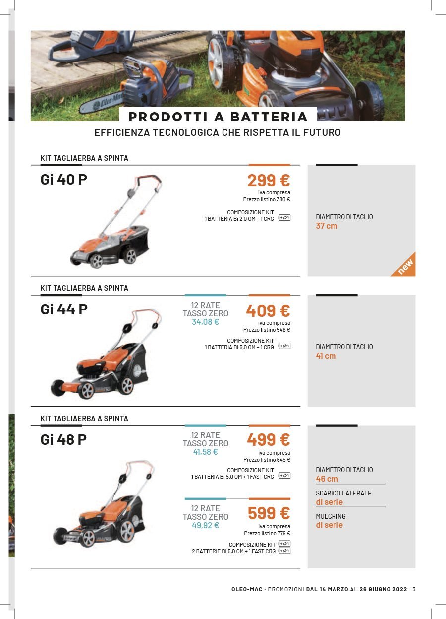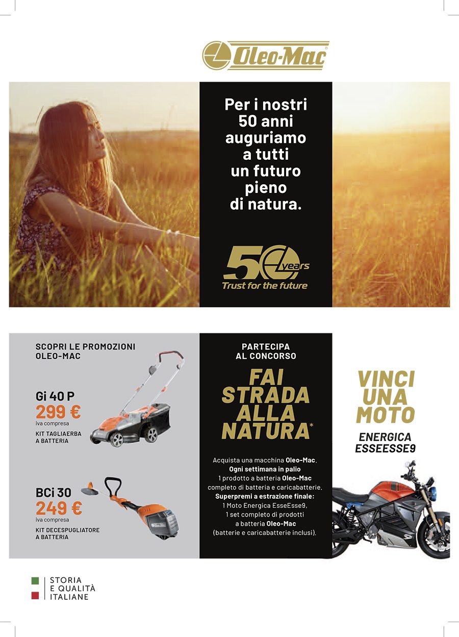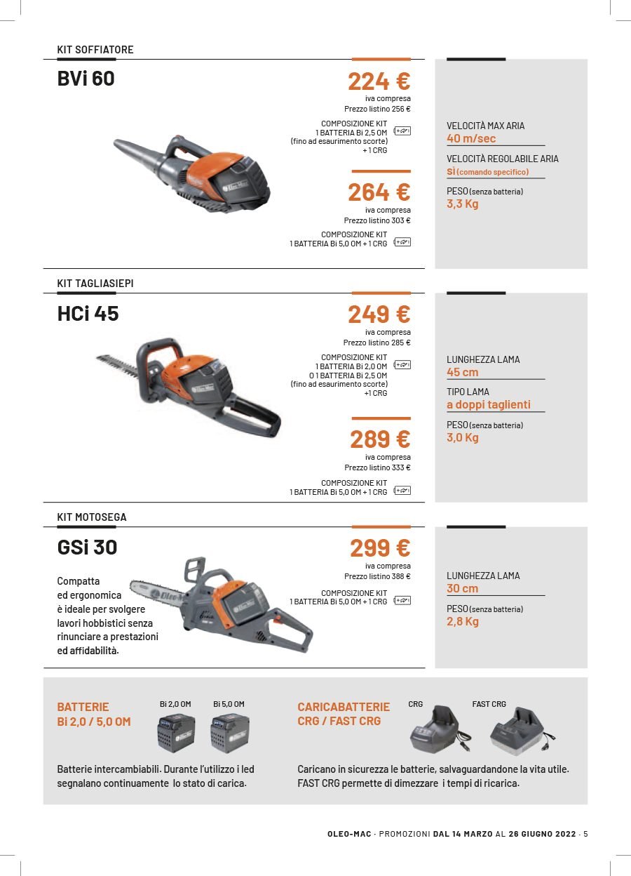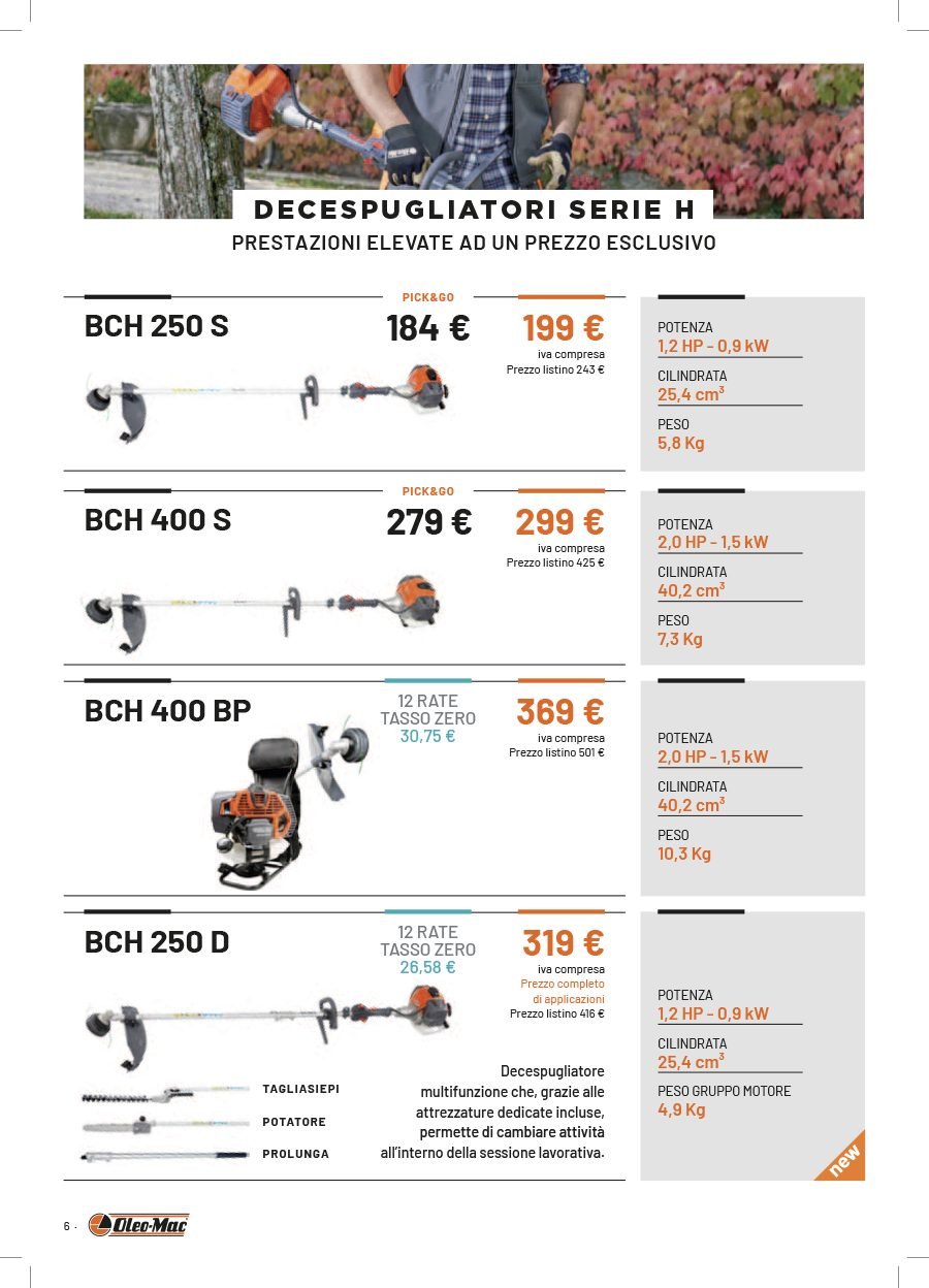 La Va.Ma. di Bussoleno ha unāampia scelta di macchine per soddisfare ogni esigenza. Tratta i prodottiĀ Oleo-Mac (il volantino al link) e Husqvarna (il volantino al link), aziende che rappresentano un punto di riferimento per professionisti e hobbysti nella manutenzione del verde. Inoltre ha scelto per la sua clientela la qualitĆ e lāaffidabilitĆ delĀ marchio italiano Nibbi. LaĀ Va.Ma.Ā si tiene costantemente aggiornata sulle ultime promozioni delle case trattate,Ā per proporre alla sua affezionata clientela le migliori offerte sul mercato. Sui volantini promozionali ĆØ possibile scegliere fra prodotti a batteria e non, tagliaerba a spinta e semoventi, soffiatori, tagliasiepi, motoseghe, potatori, decespugliatori e accessori collegati, trattorini, trinciaerba e trinciatutto, motozappe, motocarriole, idropulitrici, motopompe, abbigliamento da lavoro e molte altre attrezzature.