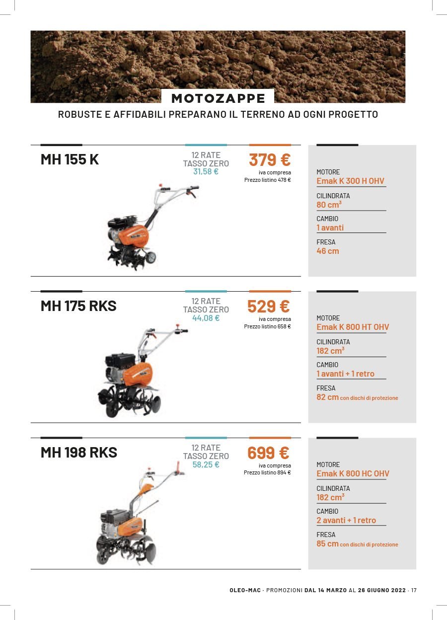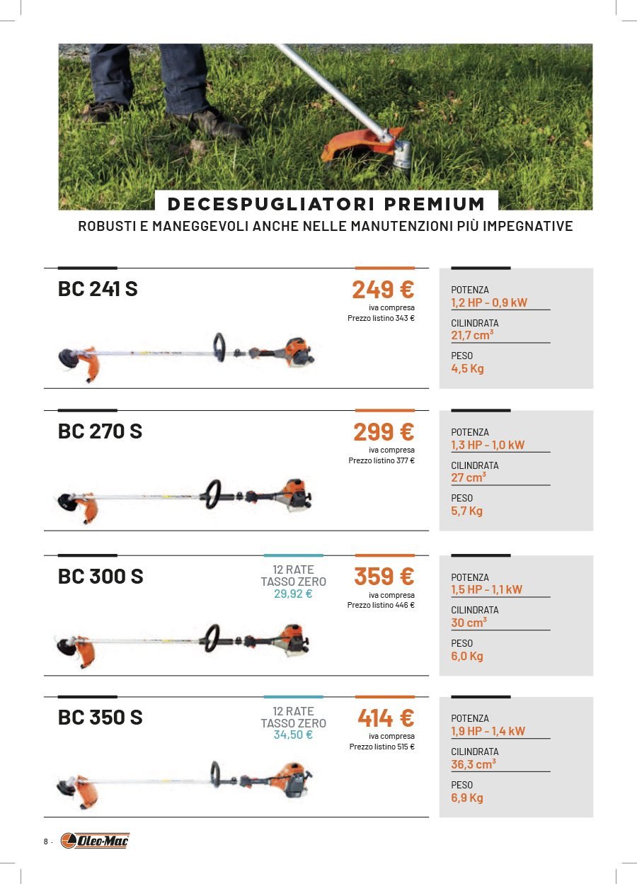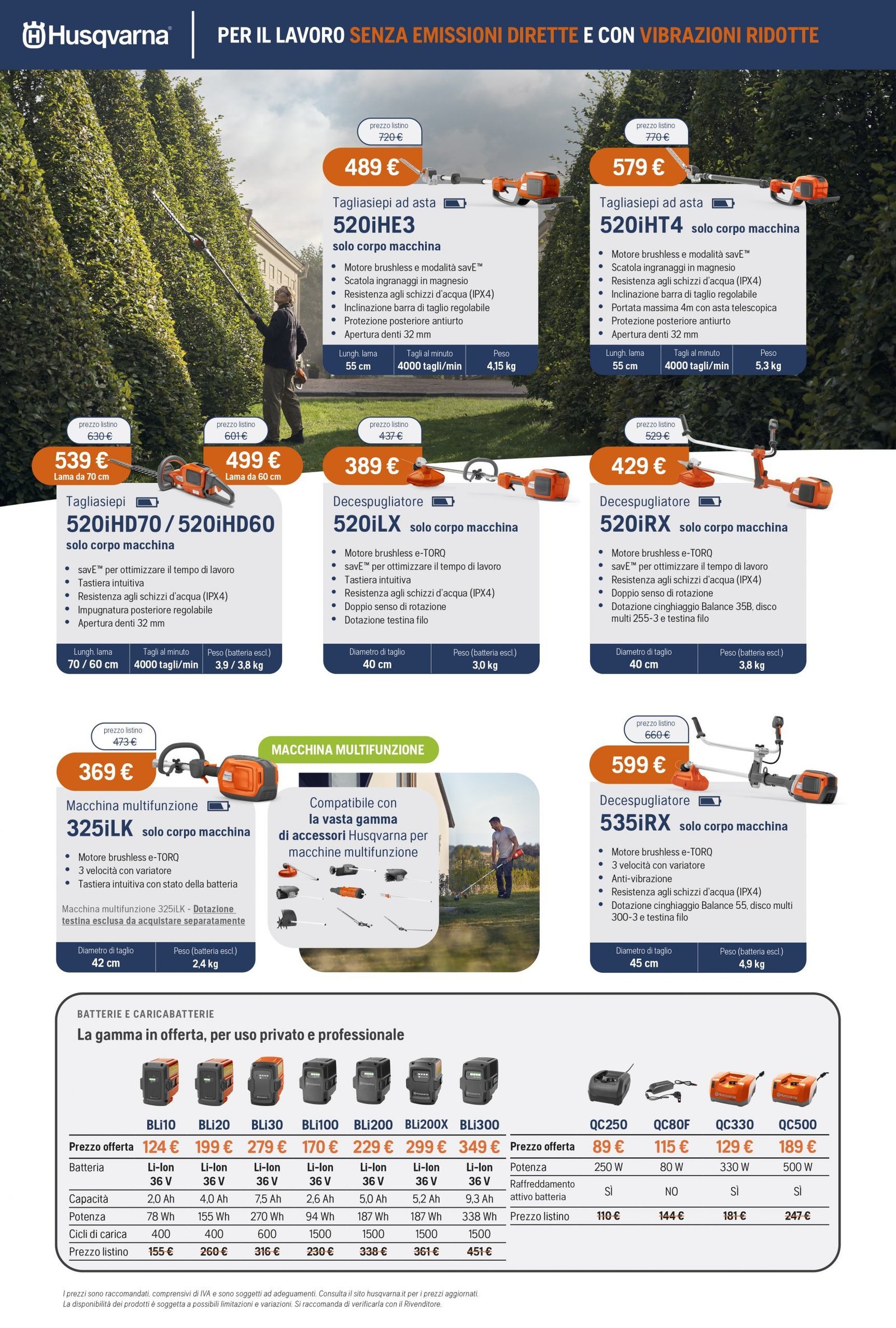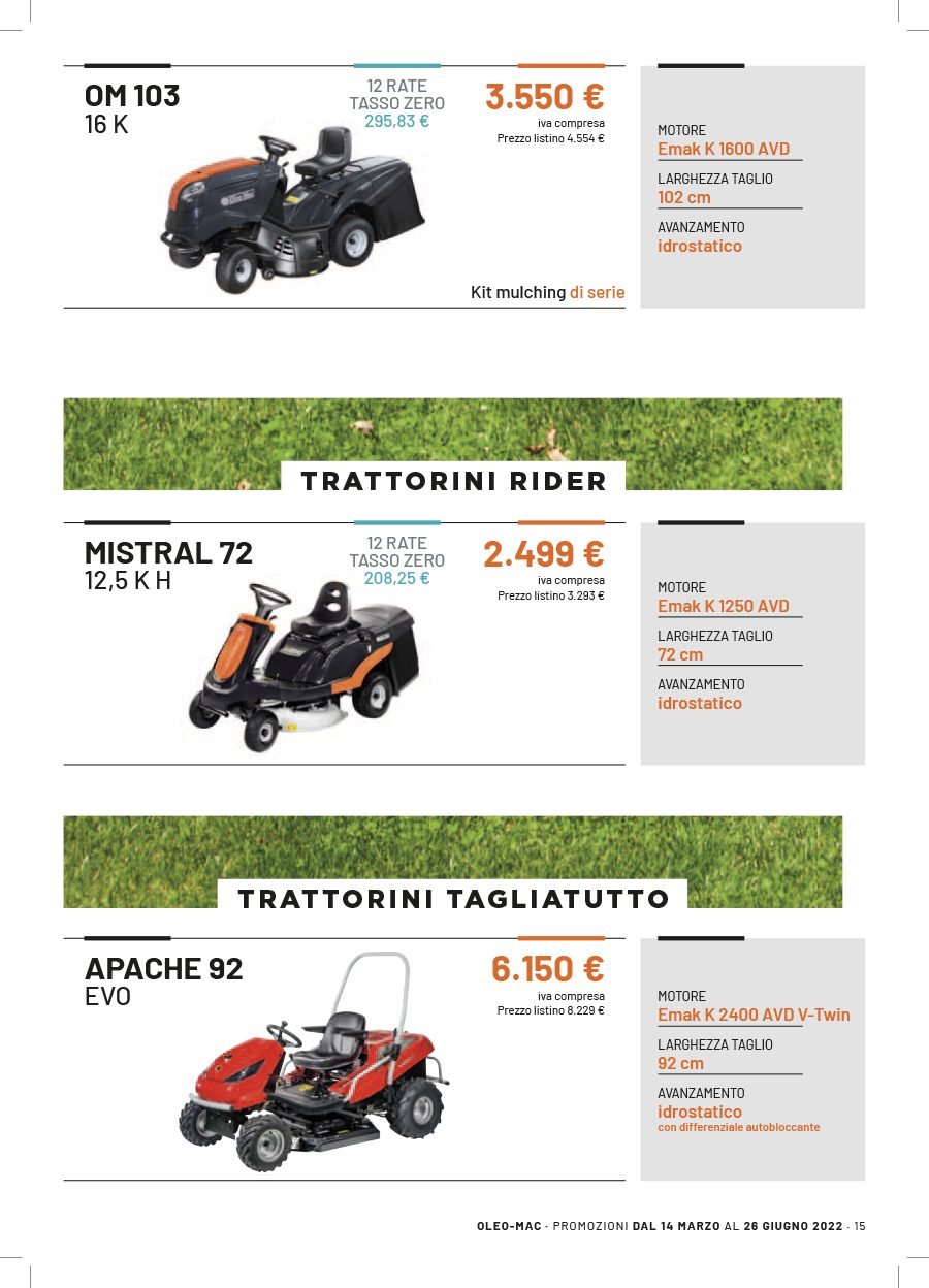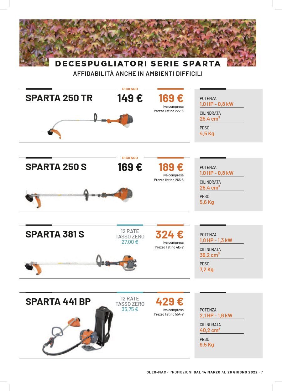 La Va.Ma. di Bussoleno ha unāampia scelta di macchine per soddisfare ogni esigenza. Tratta i prodottiĀ Oleo-Mac (il volantino al link) e Husqvarna (il volantino al link), aziende che rappresentano un punto di riferimento per professionisti e hobbysti nella manutenzione del verde. Inoltre ha scelto per la sua clientela la qualitĆ e lāaffidabilitĆ delĀ marchio italiano Nibbi. LaĀ Va.Ma.Ā si tiene costantemente aggiornata sulle ultime promozioni delle case trattate,Ā per proporre alla sua affezionata clientela le migliori offerte sul mercato. Sui volantini promozionali ĆØ possibile scegliere fra prodotti a batteria e non, tagliaerba a spinta e semoventi, soffiatori, tagliasiepi, motoseghe, potatori, decespugliatori e accessori collegati, trattorini, trinciaerba e trinciatutto, motozappe, motocarriole, idropulitrici, motopompe, abbigliamento da lavoro e molte altre attrezzature.