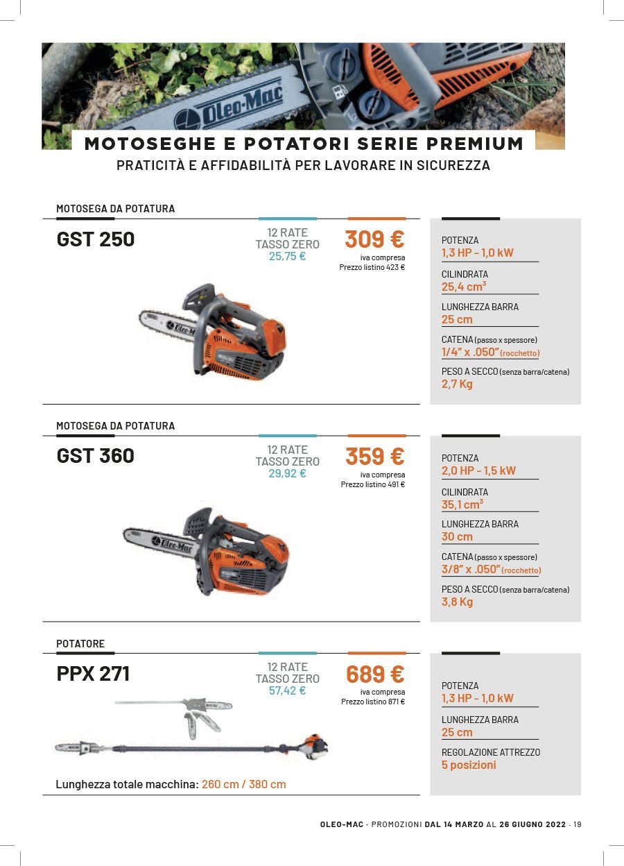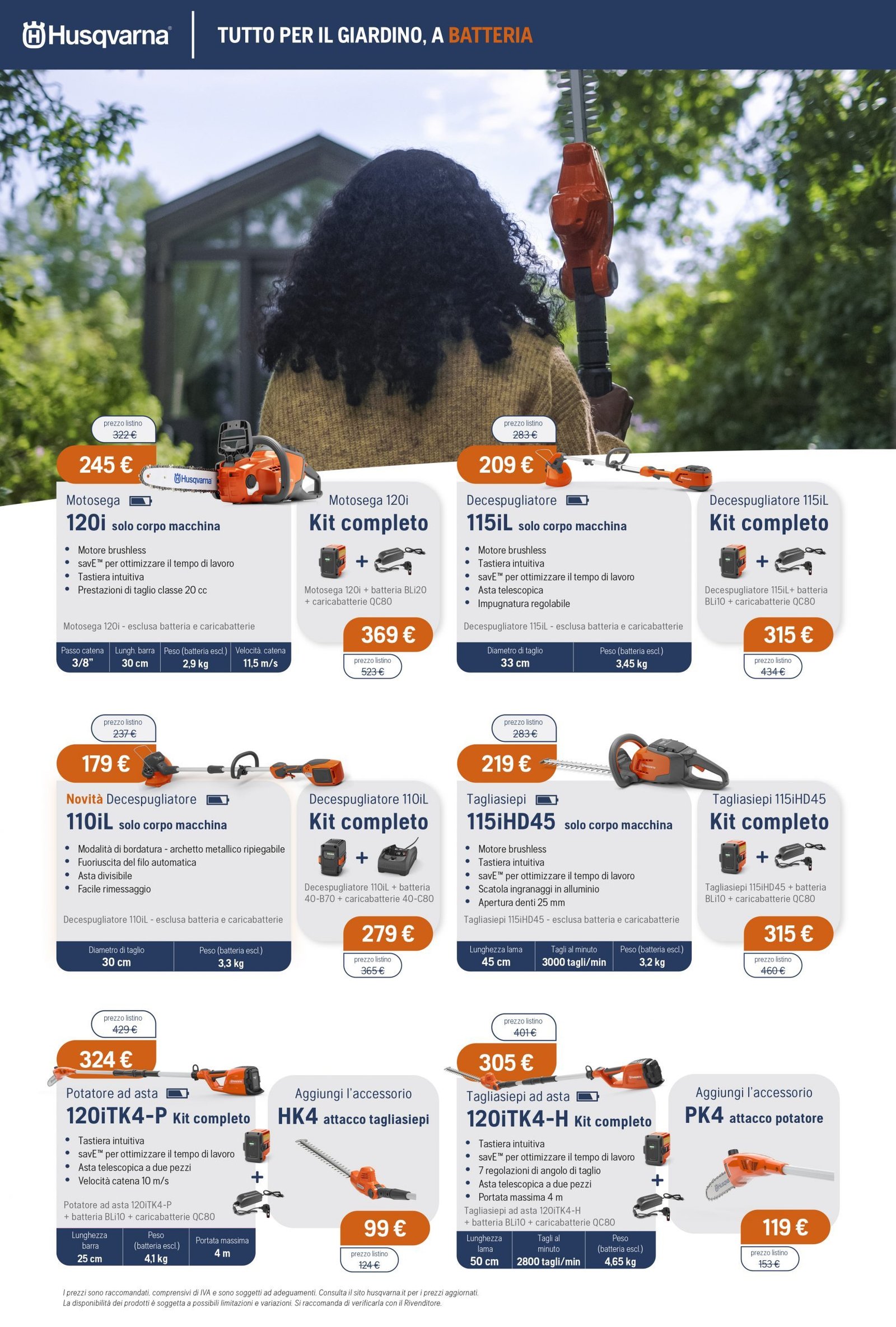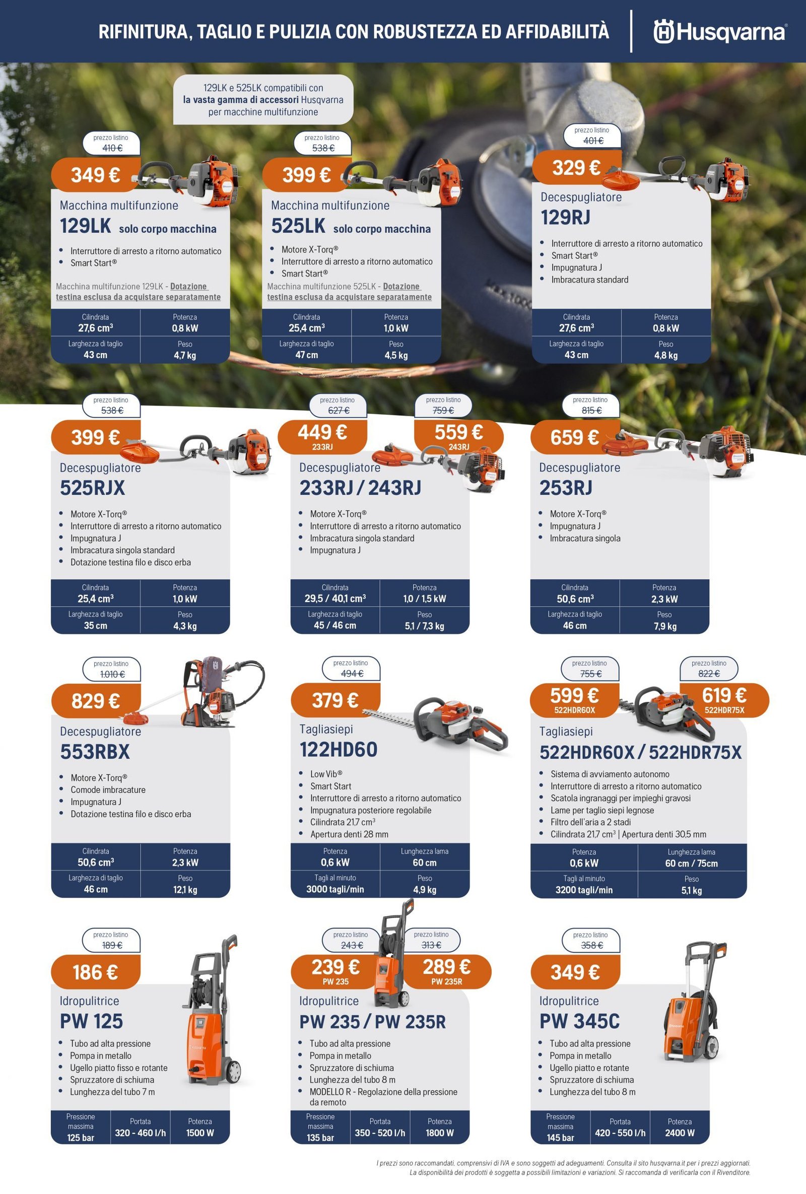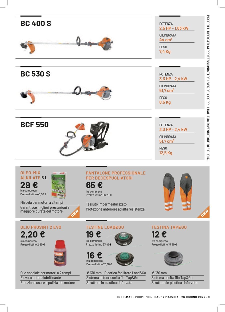 La Va.Ma. di Bussoleno ha unāampia scelta di macchine per soddisfare ogni esigenza. Tratta i prodottiĀ Oleo-Mac (il volantino al link) e Husqvarna (il volantino al link), aziende che rappresentano un punto di riferimento per professionisti e hobbysti nella manutenzione del verde. Inoltre ha scelto per la sua clientela la qualitĆ e lāaffidabilitĆ delĀ marchio italiano Nibbi. LaĀ Va.Ma.Ā si tiene costantemente aggiornata sulle ultime promozioni delle case trattate,Ā per proporre alla sua affezionata clientela le migliori offerte sul mercato. Sui volantini promozionali ĆØ possibile scegliere fra prodotti a batteria e non, tagliaerba a spinta e semoventi, soffiatori, tagliasiepi, motoseghe, potatori, decespugliatori e accessori collegati, trattorini, trinciaerba e trinciatutto, motozappe, motocarriole, idropulitrici, motopompe, abbigliamento da lavoro e molte altre attrezzature.