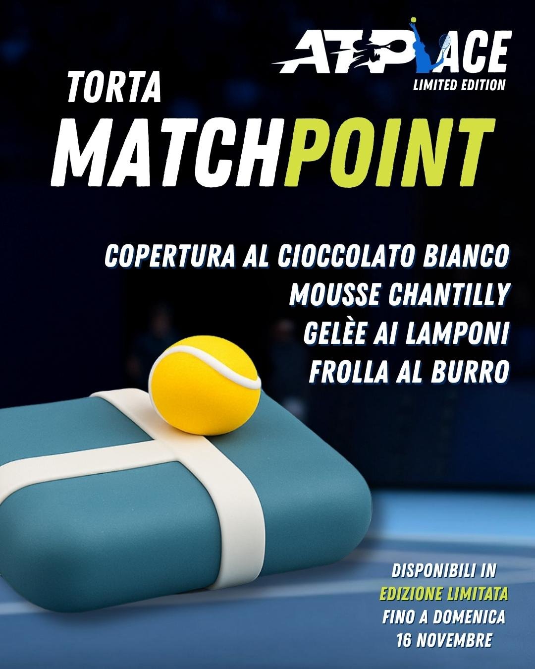 - TORTA MATCHPOINT: copertura al cioccolato bianco, mousse chantilly, gelĆØe ai lamponi, frolla al burro.