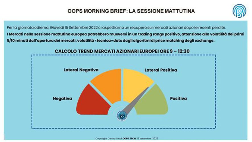 Per la giornata odierna, giovedì 15 settembre, ci aspettiamo un recupero sui mercati azionari dopo le recenti perdite. I mercati nella sessione mattutina europea potrebbero muoversi in un trading range positivo, attenzione alla volatilità dei primi 5/10 minuti dall’apertura dei mercati, volatilità “tecnica” data dagli algoritmi di price matching degli exchange. (Centro Studi OOPS Tech)