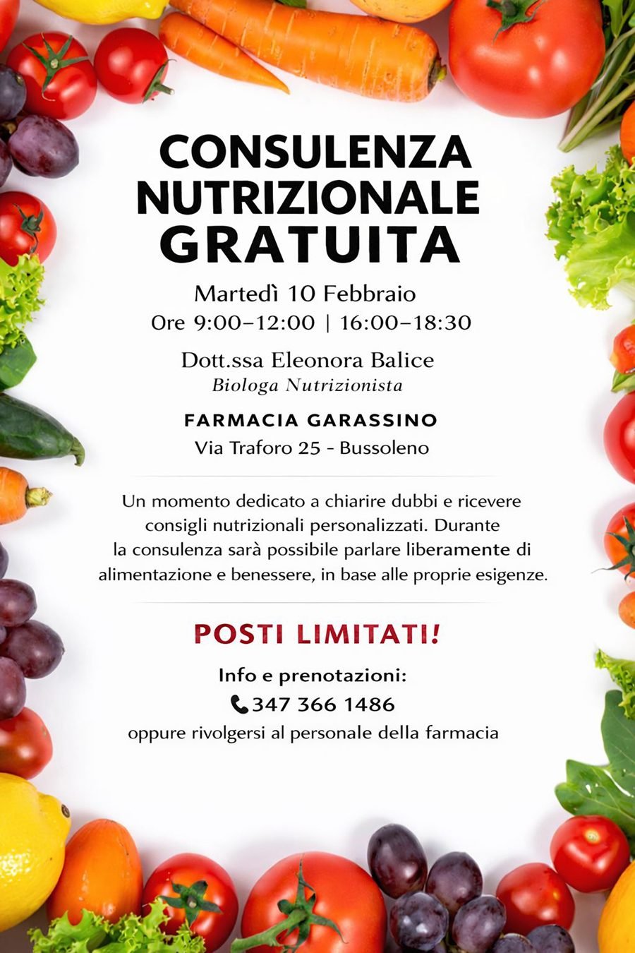 BUSSOLENO – Consulenza nutrizionale gratuita alla Farmacia Garassino di Bussoleno martedì 10 febbraio dalle ore 9 alle 12 e dalle ore 16 alle 18,30. La Dottoressa Eleonora Balice, biologa nutrizionista, sarà a disposizione per chiarire dubbi e offrire consigli nutrizionali personalizzati. Durante la consulenza sarà possibile parlare liberamente di alimentazione e benessere, in base alle proprie esigenze. I posti sono limitati, informazioni e prenotazioni al numero telefonico 347 3661486 oppure è possibile rivolgersi al personale della farmacia. È aperta sei giorni a settimana con il seguente orario: dal lunedì al sabato 8,30/12,30 – 15/19. Ha attivato il numero Whatsapp 351 3864804 per inviare le ricette o per servizi. Visita la pagina Facebook per rimanere sempre aggiornato.