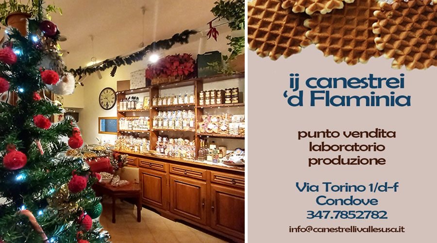 Nella bottega di Katya e Paolo si assapora il vero gusto del Natale, avvolti dai profumi e dalle fragranze dei prodotti appena sfornati. Passione, artigianalità, ricerca delle cose buone si uniscono per riscoprire e riproporre i sapori sani e genuini di un tempo. Ogni anno a Natale i cesti e le confezioni de “Ij canestrei ‘d Flaminia” stupiscono per la loro originalità e qualità, regali ricchi di eccellenza e sapori. Fra i migliori prodotti del Piemonte e della Valsusa troviamo panettoni, marroni sciroppati e glacé, crema di marroni, vini locali di antichi vitigni, miele di montagna, marmellate da agricoltura biologica, composte, liquori, tisane e essenze alpine, cioccolato artigianale, zabaione, farine di antichi mais, riso, baci di dama, amaretti morbidi, succo di mele di antiche varietà, sali aromatizzati, prodotti dolci e salati… Tutte delizie che andranno a comporre i ricchi cesti natalizi insieme ai famosi canestrelli, agli altri biscotti e alle torte del noto biscottificio condovese.
