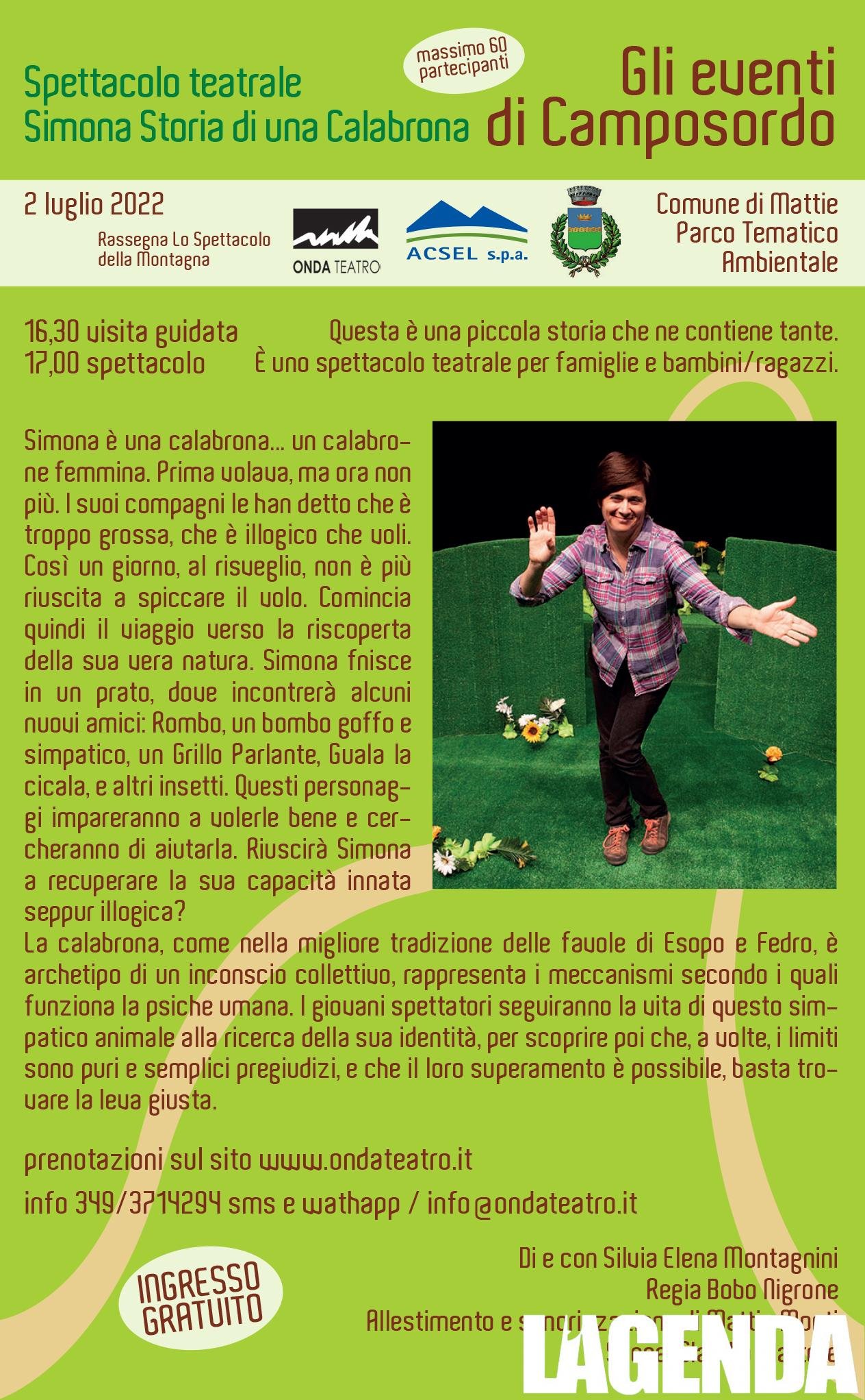 Il 2 luglio lo spettacolo teatrale Simona Storia di una Calabrona, prenotazioni sul sito www.ondateatro.it. Questa e una piccola storia che ne contiene tante. E uno spettacolo teatrale per famiglie e bambini/ragazzi. Simona e una calabrona⦠un calabrone femmina. Prima volava, ma ora non più. I suoi compagni le han detto che b troppo grossa, che e illogico che voli. Cosi un giorno, al risveglio, non e più riuscita a spiccare il volo. Comincia quindi il viaggio uverso la riscoperta della sua vera natura. Simona finisce in un prato, dove incontrerà alcuni nuovi amici: Rombo, un bombo goffo e simpatico, un Grillo Parlante, Guala la cica-la, e altri insetti. Questi personaggi impareranno a volerle bene e cercheranno di aiutarla. Riuscirà Simona a recuperare la sua capacita innata seppur illogica? La calabrona, come nella migliore tradizione delle favole di Esopo e Fedro, e archetipo di un inconscio collettivo, rappresenta i meccanismi secondo i quali funziona la psiche umana. Di e con Silvia Elena Montagnini Regia Bobo Nigrone Allestimento e sonorizzazione di mattia Monti Scene Claudia martore.