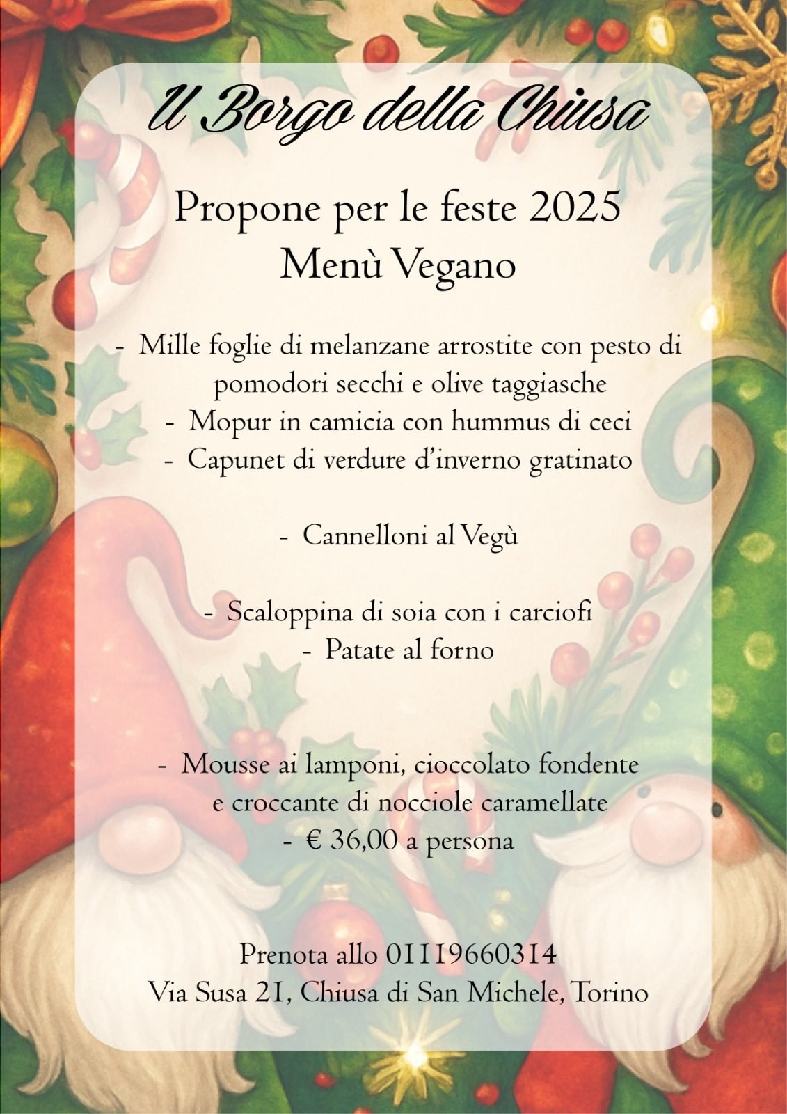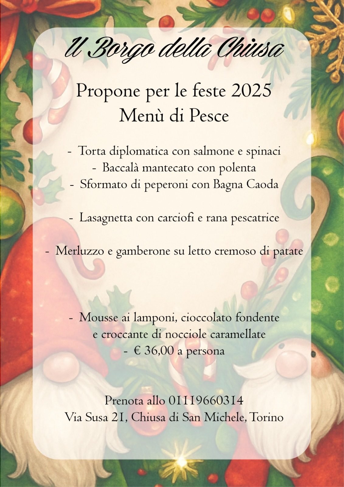 CHIUSA DI SAN MICHELE – Se desideri trascorrere i pranzi e le cene delle Feste e soprattutto di Capodanno comodamente a casa tua “Il Borgo della Chiusa”, la gastronomia caffetteria di Chiusa di San Michele, ha ideato tre Menù davvero golosi. Soddisfano i gusti di tutti, dal menù di carne a quello di pesce a quello vegano. Ai fornelli lo chef Mirko, anni di esperienza nelle migliori cucine di Torino e del Piemonte prima di inaugurare nel 2016 un locale unico in Valsusa. “Il Borgo della Chiusa” è anche una Bottega del Gusto. Sugli scaffali infatti si possono trovare prodotti dolci e salati da portare in tavola. Tutte le bontà possono essere racchiuse anche in cesti e confezioni regalo personalizzati. È possibile effettuare le ordinazioni al numero telefonico 011 19660314.