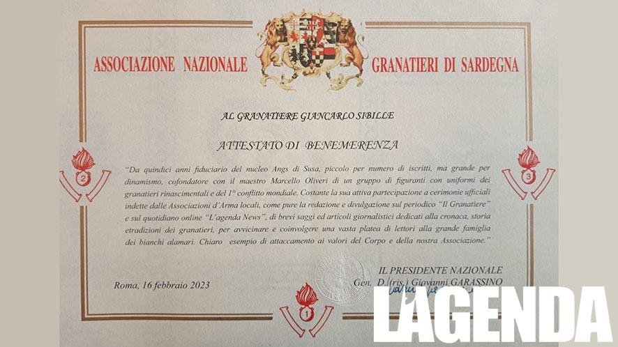 Al granatiere Giancarlo Sibille ĆØ stato consegnato lāattestato di Benemerenza dalla Presidenza Nazionale dellāAssociazione Granatieri di Sardegna con la seguente motivazione. “Da quindici anni fiduciario del nucleo Angs di Susa, piccolo per numero di iscritti, ma grande per dinamismo, cofondatore con il maestro Marcello Oliveri di un gruppo di figuranti con uniformi dei granatieri risorgimentali e del 1° conflitto mondiale. Costante la sua attiva partecipazione a cerimonie ufficiali indette dalle Associazioni dāArma locali.