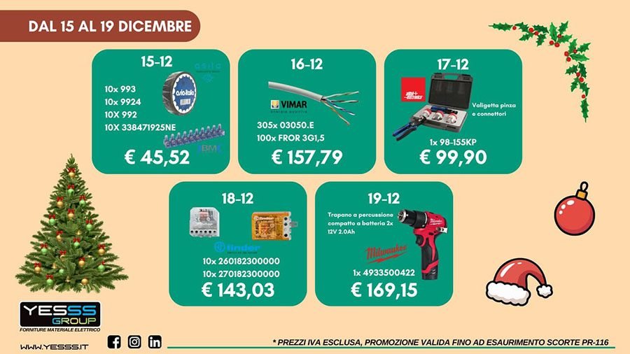 TORINO ā Grandi promozioni in vista del Natale da Yesss Group, il negozio di forniture di materiale elettrico in Valsusa, a Torino e provincia. Con il Calendario dellāAvvento Yesss dal 15 al 19 dicembre sono attive 5 offerte dedicate ai professionisti dellāelettrico: prodotti utili, prezzi speciali e quantitĆ limitate. Scopri la la promozione⦠e non perderti lāanteprima della quarta settimana, in arrivo dal 22 dicembre. Per rimanere sempre aggiornato segui la pagina Facebook, i profiliĀ InstagramĀ eĀ LinkedlnĀ e ilĀ sito internet. Il team ti aspetta nelle filiali di Avigliana, LeinƬ, Rivoli, Torino, Settimo Torinese, Moncalieri e Roletto! Ā Gli orari delle 7 sedi alĀ LINK.