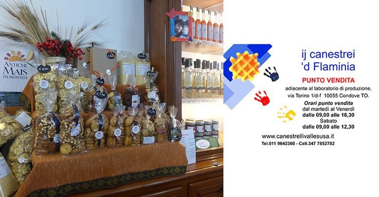 Katya e Paolo de “Ij Canestrei ‘d Flaminia” da sempre hanno intrecciato rapporti con piccole aziende valsusine che producono a km 0. Vini locali di antichi vitigni, miele di montagna, marmellate da agricoltura biologica, liquori, tisane, marroni, cioccolato, zabaione, idromele, creme alla nocciola, genepy, liquori, farine di antichi mais e molto altro. Tutti i prodotti sono della Valsusa e del Piemonte. Delizie che si aggiungono ai famosi canestrelli, agli altri biscotti e alle crostate del biscottificio di Condove. Un laboratorio di produzione, dove entrando si viene avvolti da profumi e fragranze travolgenti.