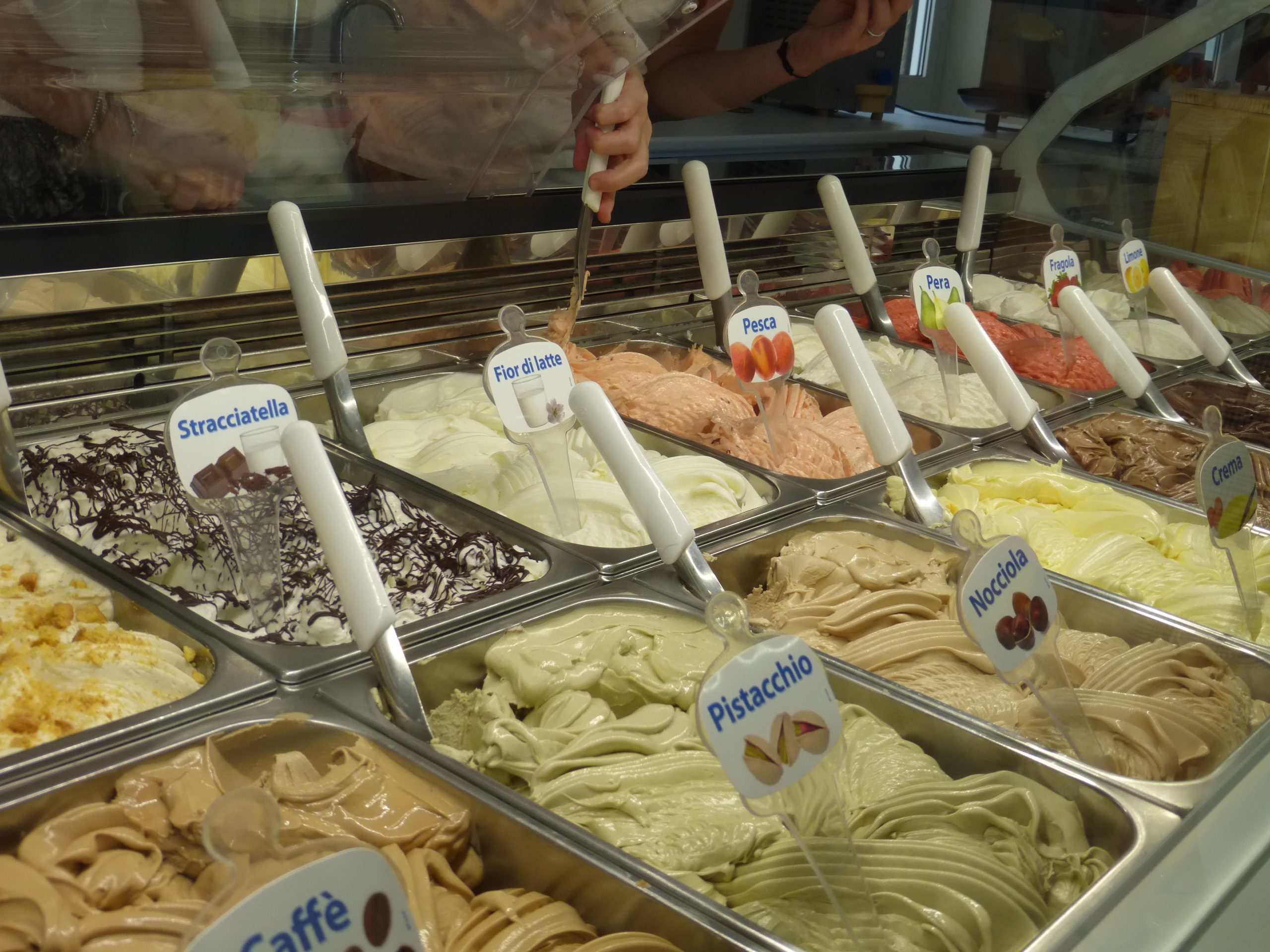 Fior di latte, vaniglia, nocciola, pistacchio, marron glacé, cioccolato, limone, kibana ( kiwi + banana).