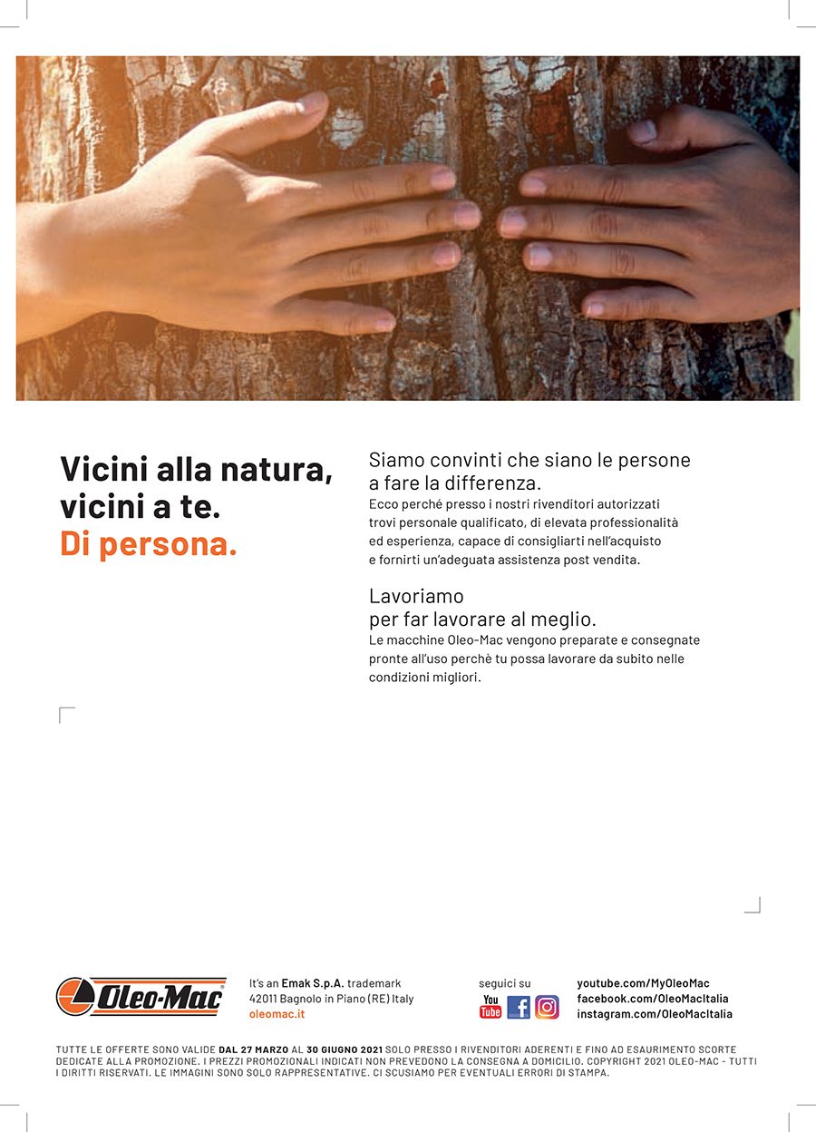 AllaĀ Va.Ma. macchine agricole di Bussoleno sono tantissime le promozioni primaverili Oleo-Mac, Husqvarna e Nibbi. La natura continua il suo corso e si ĆØ risvegliata nonostante il difficile periodo che stiamo vivendo. In questi giorni di isolamento forzato perchĆ© non dedicarsi alla cura del verde, del proprio orto in vista dellāestate? LaĀ Va.Ma.Ā presta unāassistenza pre e post vendita completa sulle macchine agricole, con ricambi e accessori originali. Grazie allāesperienza acquisita nel campo delle riparazioni di macchine agricole, garantisce un servizio professionale in grado di soddisfare ogni singola esigenza del cliente privato o professionista. Per chi desidera lavorare con strumenti validi ed efficaci, laĀ Va.Ma.Ā ĆØ un vero riferimento in Valsusa. I marchi trattati risultano essere tra i migliori nel settore, garantendo ottime prestazioni, durata e una reperibilitĆ dei pezzi di ricambio garantita nel tempo.