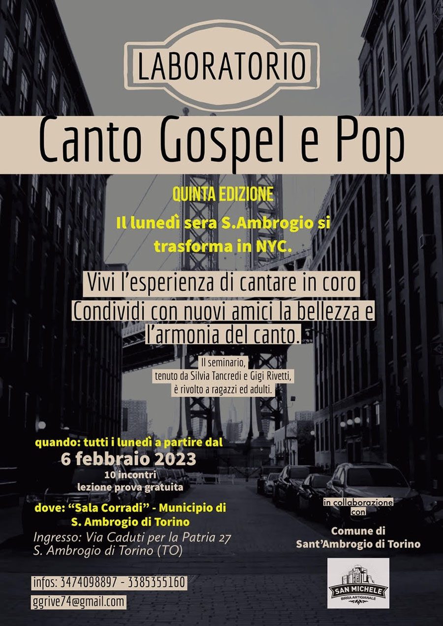 SANT’AMBROGIO – Quinta edizione del Laboratorio di Canto Gospel e Pop tenuto da Silvia Tancredi e Gigi Rivetti a Sant’Ambrogio di Torino. “Il lunedì sera Sant’Ambrogio si trasforma in New York City: vivi l’esperienza di cantare in coro. Condividi con nuovi amici la bellezza e l’armonia del canto“. Il Masterclass di Canto Gospel e Pop si tiene regolarmente da alcuni anni a Sant’Ambrogio, ma da quest’anno la sede sarà la “Sala Corradi” all’interno del Municipio, in Via Caduti per la Patria, 27. Rimane sempre attiva la collaborazione con il Comune e con il “Birrificio San Michele” per quanto riguarda le attività live. L’inizio del corso, rivolto a ragazzi e adulti, è lunedì 6 febbraio alle ore 20,45. Gli incontri saranno dieci, lezione di prova gratuita. Per informazioni 347 4098897 – 338 5355160 oppure mail: ggrive74@gmail.com.
