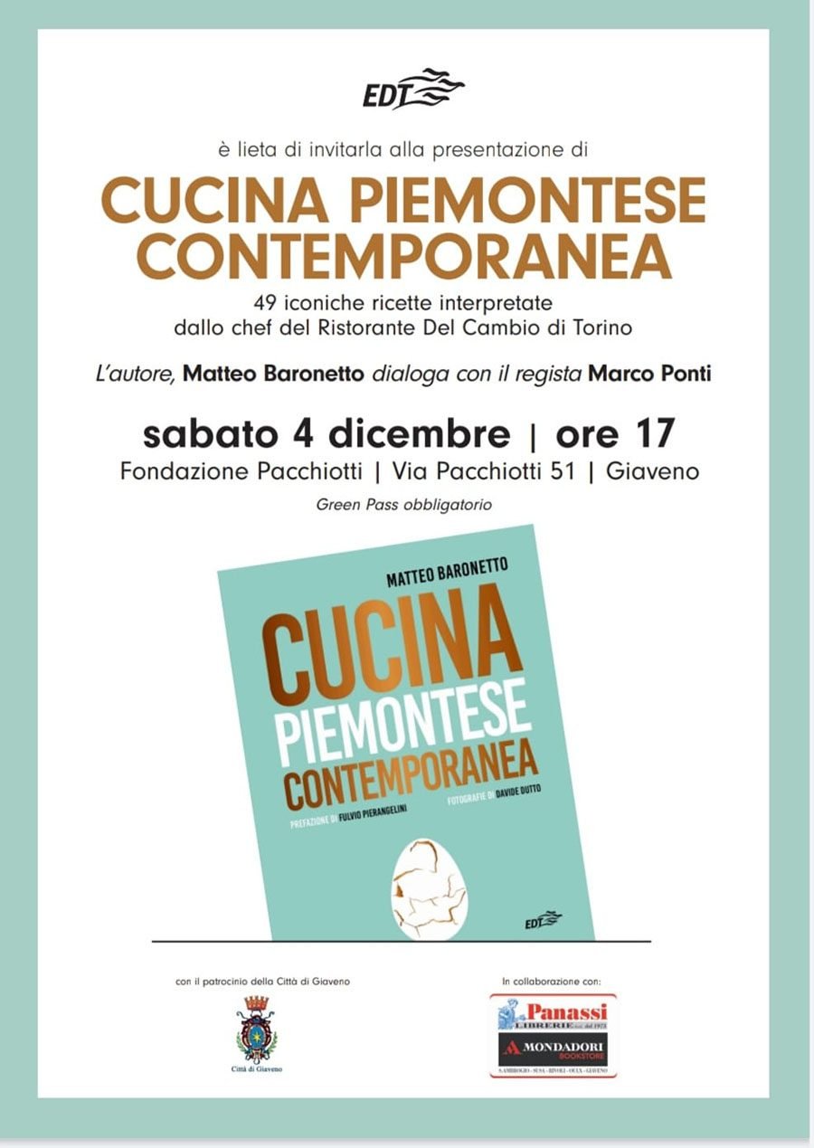 GIAVENO – Le Librerie Panassi vi invitano alla presentazione del libro “Cucina piemontese contemporanea” dello chef Matteo Baronetto, edizioni Edt. Il libro raccoglie 49 iconiche ricette interpretate dallo chef del Ristorante del Cambio di Torino. L’autore Matteo Baronetto dialoga con il regista Marco Ponti. La presentazione si terrĆ sabato 4 dicembre alle ore 17 alla Fondazione Pacchiotti in Via Pacchiotti, 51 a Giaveno, Green Pass obbligatorio.