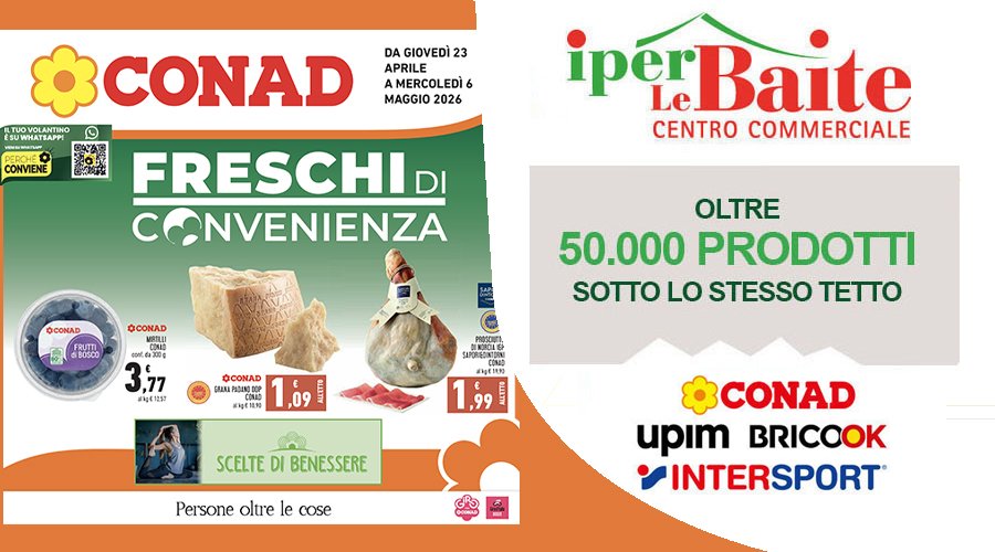 OULX ā Le migliori occasioni per la tua spesa? Ma vai da Conad all’Iper Le Baite di Oulx! Freschi di convenienza: tante offerte sui prodotti FRESCHI dal 23/04 al 6/05! Sfoglia il nuovo catalogo qui sotto e inaugura con gusto questo lungo ponte di primavera in Valsusa! La convenienza del tuo Conad di fiducia ĆØ anche su WhatsApp: clicca per collegarti e avere tutte le offerte a portata di mano! Per rimanere sempre aggiornato segui la pagina Facebook, il profilo Instagram e il sito internet dellāIper Le Baite di Oulx.