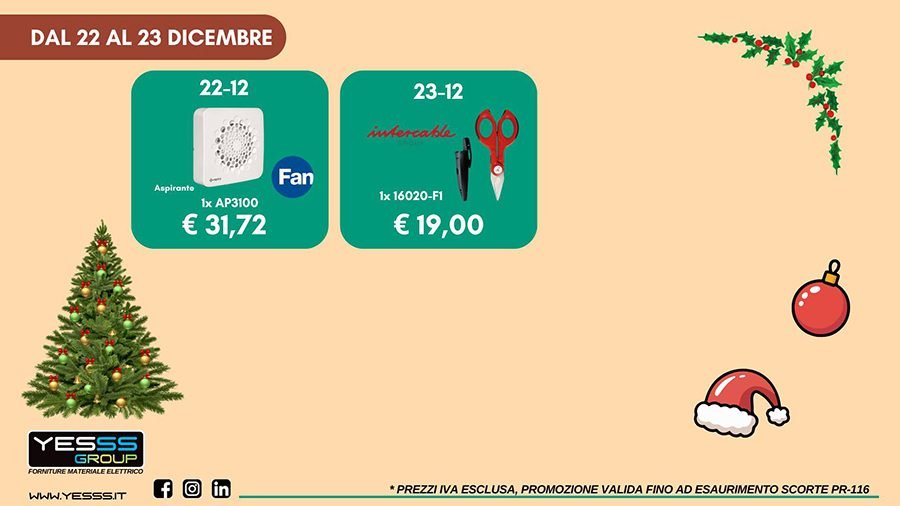 TORINO ā Ultime promozioni di Natale da Yesss Group, il negozio di forniture di materiale elettrico in Valsusa, a Torino e provincia. Siamo arrivati alla quarta tappa del Calendario dellāAvvento Yesss 2025! Dal 22 al 23 dicembre le ultime due offerte dedicate ai professionisti dellāelettrico: pratiche e convenienti. Prodotti utili, prezzi speciali e quantitĆ limitate. Per rimanere sempre aggiornato segui la pagina Facebook, i profiliĀ InstagramĀ eĀ LinkedlnĀ e ilĀ sito internet. Il team ti aspetta nelle filiali di Avigliana, LeinƬ, Rivoli, Torino, Settimo Torinese, Moncalieri e Roletto! Ā Gli orari delle 7 sedi alĀ LINK. Il team augura a tutti BUONE FESTE!