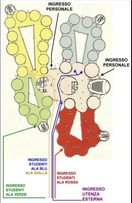 Il primo giorno è dedicato unicamente alle prime classi. L’alunno potrà entrare a scuola al massimo 10 minuti prima dell’inizio delle lezioni utilizzando, a seconda dell’aula che deve raggiungere, le apposite entrate segnalate sulla mappa allegata. Lunedì 14, martedì 15 e mercoledì 16 settembre ingresso alle ore 8.45. Le prime liceo Classico, Linguistico, Scientifico e Scientifico applicato dall’ingresso Blu. Poi le prime Liceo Scientifico Sportivo entrata Rosso con formazione delle classi fuori dalla scuola. Prime Tecnico Turistico entrata Giallo. Prime Professionale Design e Multimedia entrata Verde. Nel rispetto delle normative Coronavirus la presentazione sarà fatta solo con gli allievi e non con la presenza anche dei genitori. Si svolgeranno tre ore di lezione con la scansione oraria: dalle 8,45 alle 11,45.