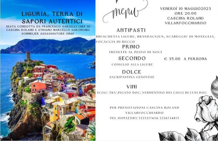 VILLAR FOCCHIARDO ā VenerdƬ 10 maggio alle ore 20 a Cascina Roland a Villar Focchiardo ĆØ in programma una serata dal titolo “Liguria, terra di sapori autentici“. Per l’occasione ĆØ stato ideato un menù a tema e la serata sarĆ condotta da Franco Garzelli, lo chef di Cascina Roland, e Marcello Striano, agronomo sommelier e assaggiatore Onaf. Ć gradita la prenotazione ai numeri 011 19323183 – 333 5377434 ā 333 6734875.