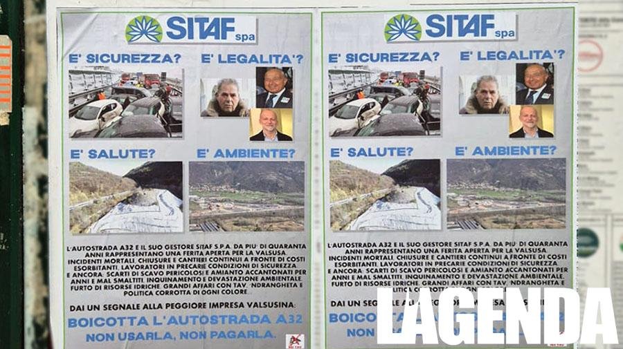 Nella notte in alcuni comuni della Valsusa sono stati affissi sui tabelloni elettorali dei manifesti contro Sitaf firmati No Tav. Il testo riporta: “L’Autostrada A32 e il suo gestore Sitaf S.p.a. da più di quaranta anni rappresentano una ferita aperta per la Valsusa. Incidenti mortali, chiusure e cantieri continui a fronte di costi esorbitanti. Lavoratori in precarie condizioni di sicurezza e ancora scarti di scavo pericolosi e amianto accantonati per anni e mal smaltiti. Inquinamento e devastazione ambientale. Furto di risorse idriche. Grandi affari con Tav, ‘ndrangheta e politica corrotta di ogni colore. Dai un segnale alla peggiore impresa valsusina. Boicotta l’autostrada A32, non usarla, non pagarla“. Sitaf SpA ĆØ concessionaria dellāAutostrada A32 Torino-Bardonecchia, lāasse autostradale che collega il capoluogo piemontese al Traforo del Frejus.