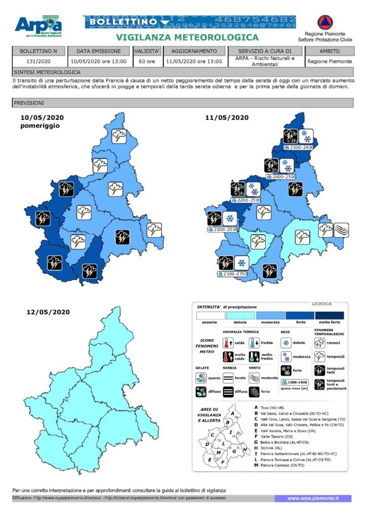 SUSA – Meteo, il bollettino dell’ARPA riporta un livello di allerta “giallo” per le prossime 36 ore. È stato aggiornato oggi 10 maggio alle ore 13 il bollettino di allerta meteoidrologica da parte di ARPA Piemonte. È dunque segnalato un marcato aumento dell’instabilità atmosferica con fenomeni localizzati. Oltre che il possibile verificarsi di locali allagamenti, caduta alberi, fulminazioni, isolati fenomeni di versante e innalzamento dei corsi d’acqua secondari.