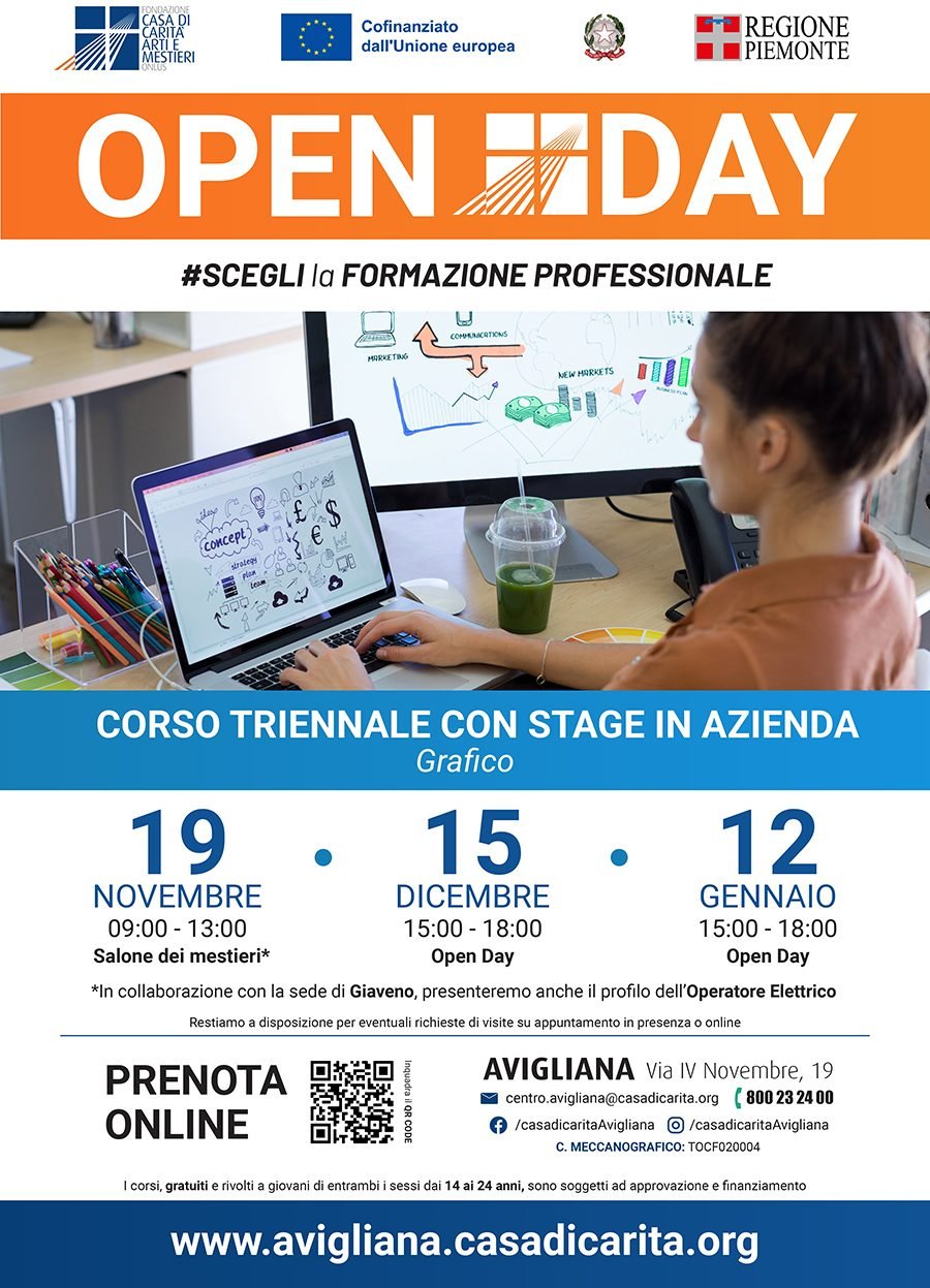 - Giovedì 15 dicembre “Open day” ad Avigliana dalle 15 alle 18, presso il nostro centro di formazione “La Fabrica” in via IV Novembre.