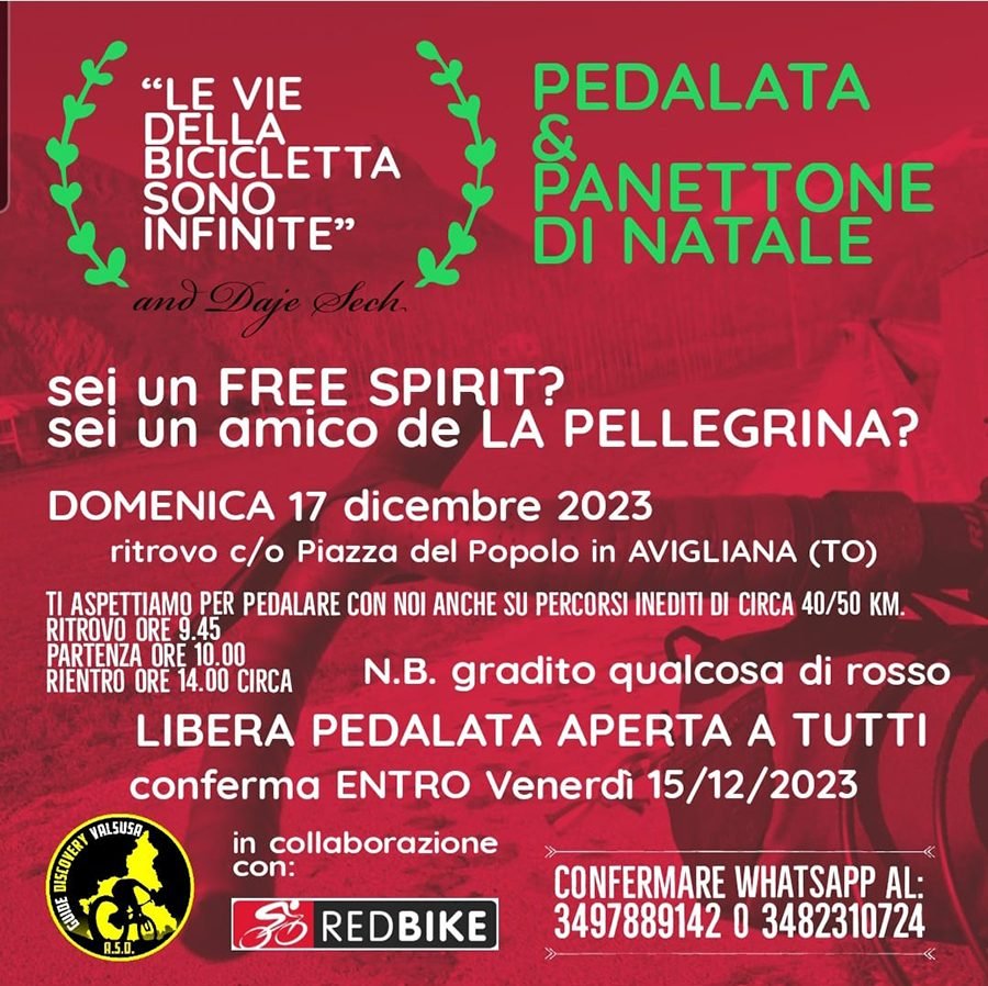 AVIGLIANA ā Pedalata e Panettone di Natale domenica 17 dicembre ad Avigliana: le vie della bicicletta sono infinite! Sei un free spirit? Sei un amico de La Pellegrina? Domenica 17 dicembre il ritrovo ĆØ in Piazza del Popolo in Avigliana alle ore 9.45 con partenza alle ore 10.00 e rientro ore 14.00. L’invito ĆØ: “Ti aspettiamo per pedalare con noi anche su percorsi inediti di circa 40/50 km. Ć gradito che si indossi qualcosa di rosso! Il cicloturismo ĆØ per tutti; “sensazioni non prestazioni” e allora…pedalabojafauss. Se non hai la bici giusta, no problem… te la troviamo noi, volendo e-bike disponibili…” Pedalata e Panettone di Natale ĆØ una libera pedalata aperta a tutti. Conferma la tua presenza entro venerdƬ 15 dicembre ai numeri Whatsapp 3491889142 – 3482310724, in modo che ci si possa organizzare al meglio per il terzo tempo, ovvero la panettonata e il brindisi. La pedalate ĆØ organizzata in collaborazione con Red Bike, il negozio di bici di Rivoli e GUIDE “Discovery Valsusa”.
