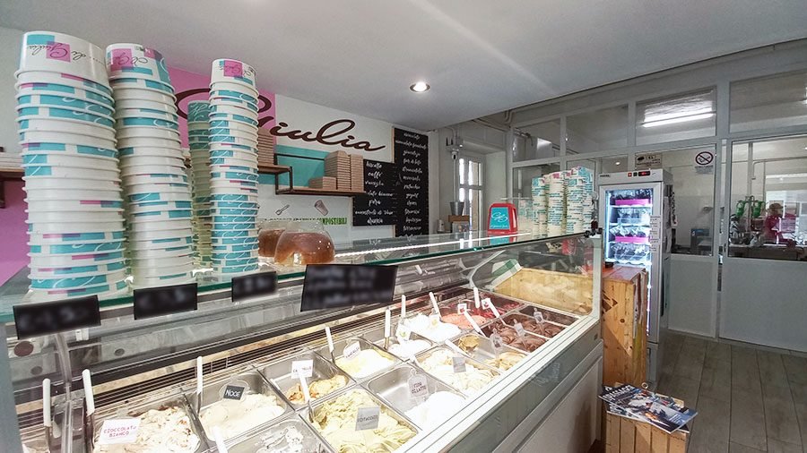 La gelateria “Il gelato di Giulia” di Borgone produce inoltre tante bontà nel suo laboratorio annesso al punto vendita. Giulia con entusiasmo e passione ogni giorno sceglie gli ingredienti da utilizzare per gelati, semifreddi, torte, monoporzioni, stecchi e biscotti gelato. Moltissimi ingredienti sono a km 0, acquistati direttamente dai produttori che valorizzano il territorio. Il gelato è prodotto con latte fresco di cascina e uova biologiche. Le materie prime sono sempre eccelse: dal pistacchio, alle nocciole Piemonte, al cioccolato migliore… I gusti alle creme e quelli alla frutta lentamente vengono lavorati e poi trionfano nel bancone del negozio, a casa degli affezionati clienti, sulle tavole e in giro per la Valsusa grazie all’a-Pina. La gelateria “Il gelato di Giulia” è vincitrice del riconoscimento “Maestro del Gusto”. I Maestri del Gusto sono selezionati ogni due anni dalla Camera di commercio di Torino, dal Laboratorio Chimico camerale e Slow Food. Sono veri e propri testimoni del gusto torinese. Con la loro passione per genuinità, territorio e qualità dei prodotti ogni giorno guidano alla scoperta dei sapori e delle specialità di Torino e provincia.