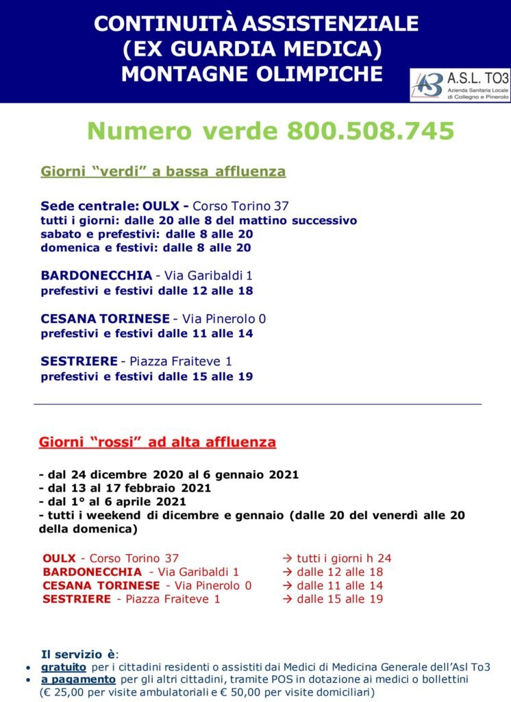 Il servizio parte giovedƬ 24 dicembre e sarĆ in funzione fino al 6 aprile 2021. Con un rafforzamento nel periodo delle festivitĆ natalizie e pasquali e nei giorni di Carnevale. Oltre che durante i fine settimana fino a gennaio. In ogni caso, gli operatori saranno contattabili al numero verde 800.508.745, gratuito e istituito appositamente. La sede centrale ĆØ ad Oulx, presso il Polo sanitario, con Bardonecchia, Cesana Torinese e Sestriere come sedi āsatelliteā (in allegato, la locandina con dettagli e orari di apertura). Il servizio ĆØ gratuito per i cittadini con la residenza o il domicilio nellāarea territoriale dellāAsl To3. Per le altre persone ĆØ richiesto un ticket di 25 euro per le visite ambulatoriali e di 50 euro per le eventuali visite domiciliari.