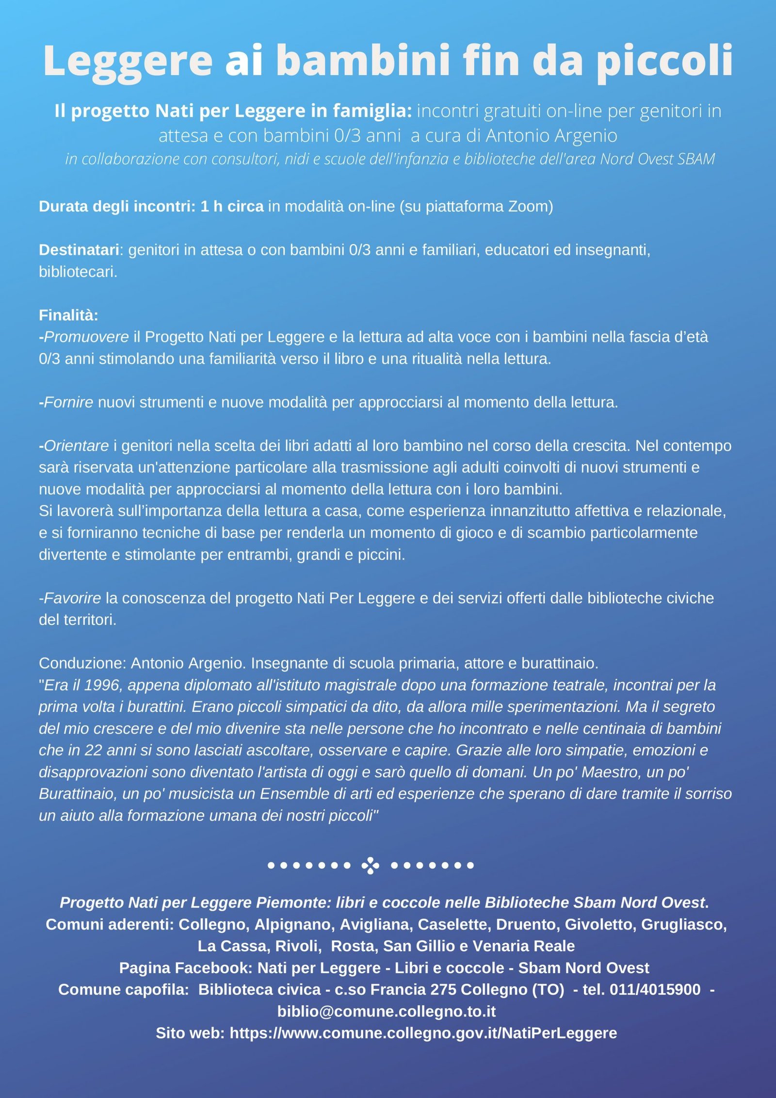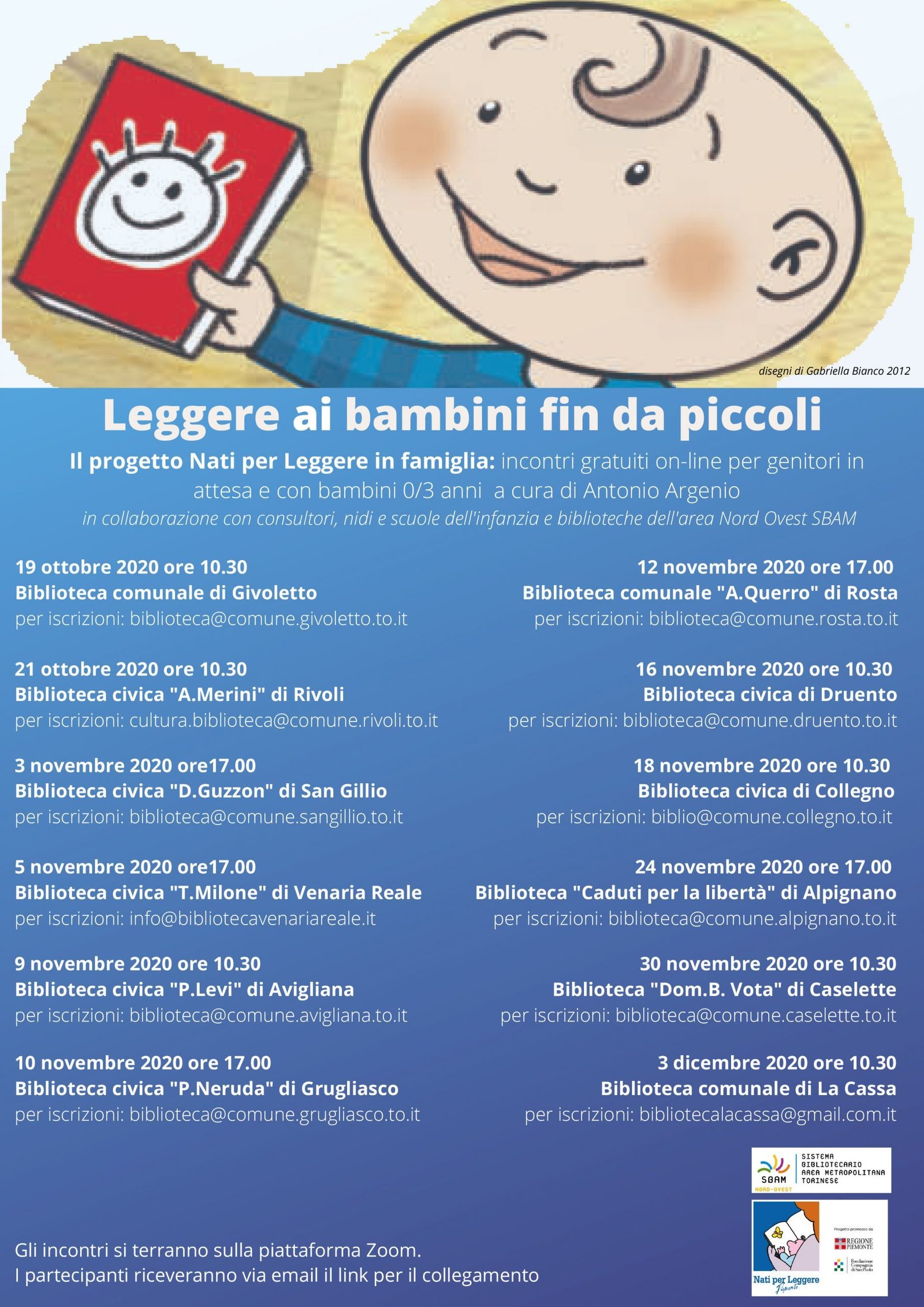 RIVOLI – Leggere ai bambini fin da piccoli, incontri gratuiti on line per genitori in attesa e con bambini 0 a 3 anni ĆØ anche a Rivoli. Lāevidenza scientifica dimostra che i primi anni di vita sono fondamentali per la salute e lo sviluppo intellettivo, linguistico, emotivo e relazionale del bambino, con effetti significativi per tutta la vita adulta. Nati per Leggere. Sviluppato assieme allāAssociazione Culturale Pediatri, lāAssociazione Italiana Biblioteche e il Centro per la Salute del Bambino, il programma ĆØ presente in tutte le regioni italiane. Propone gratuitamente alle famiglie con bambini fino a 6 anni di etĆ attivitĆ di lettura che costituiscono unāesperienza importante per lo sviluppo cognitivo dei bambini e per lo sviluppo delle capacitĆ dei genitori di crescere con i loro figli. Le attivitĆ sono realizzate con il contributo economico del Centro per il Libro e la Lettura.