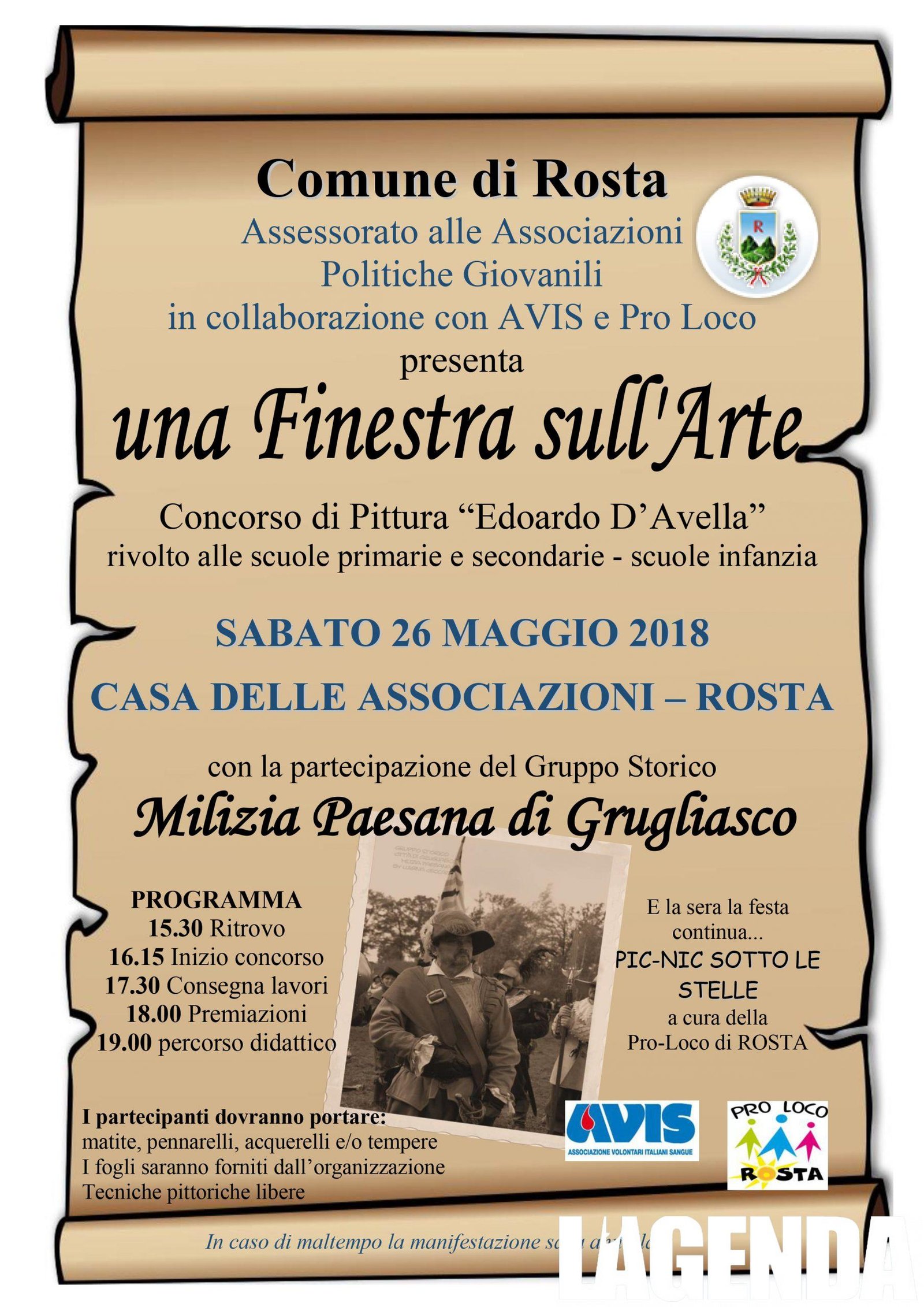ROSTA – Le associazioni di Rosta sono scese in piazza ieri in occasione della Finestra sull’Arte. Nella manifestazione anche il concorso di pittura dedicato alla memoria di Edoardo D’Avella. La giornata è organizzata dal Comune in collaborazione con Pro Loco Rosta con la partecipazione anche l’Asilo Aprà con i lavori dei bimbi. La gara di pittura ha ogni anno un tema differente e vede bambini cimentarsi con pennelli, pennarelli e altre tecniche pittoriche nel rappresentare questo importante impegno sociale. La pittura. Essendo i pigmenti essenzialmente solidi, è necessario utilizzare un legante, chiamato medium, che li porti a uno stadio di impasto stendibile, più fluido o più denso, e che permetta anche l’adesione duratura al supporto una volta che interviene un processo di asciugamento, di presa o di polimerizzazione.