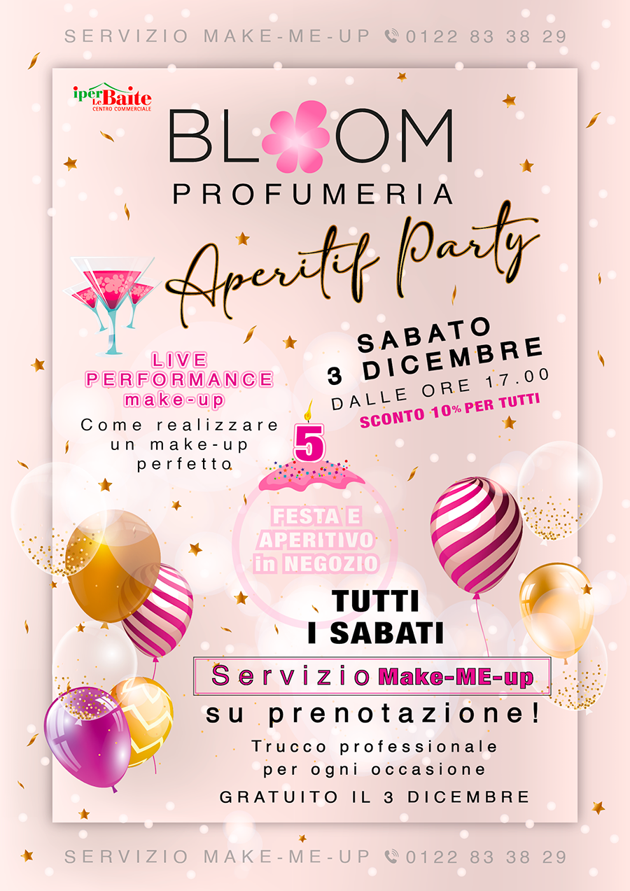 OULX – Sabato 3 dicembre, dalle ore 17 alle 19, il Centro Commerciale Le Baite di Oulx festeggia il 5° compleanno della profumeria Bloom. In programma un ricco Aperitivo e Performance di make-up su come realizzare un make-up perfetto! Bloom offrirà inoltre lo sconto del 10% a tutti. Il negozio con la festa promuove un nuovo servizio che sarà attivo solo al sabato, per chi volesse un trucco professionale per ogni occasione: servizio “make-me-up“, su prenotazione. Gratuito solo il 3 dicembre! Per prenotare il servizio make-me-up è sufficiente contattare il numero telefonico 0122 833829.