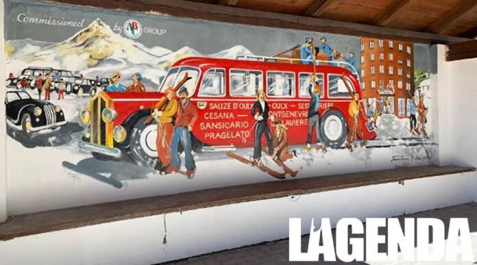 “Siamo poi particolarmente grati che il soggetto individuato sia l’immagine d’epoca del famoso artista torinese Felice Vellan, che è anche l’autore del celebre affresco dell’Alpino sulla facciata del rifugio Ciao Pais. Per la pensilina di viale Genevris è stata individuata come soggetto la famosa corriera rossa d’antan. L’affresco è poi stato dipinto magistralmente da Johnny Quence. Il Comune si è poi fatto carico della tinteggiatura dell’area attorno. Come Amministrazione Comunale ringraziamo quindi Alessandro Perron Cabus per questo dono artistico alla nostra stazione turistica”.