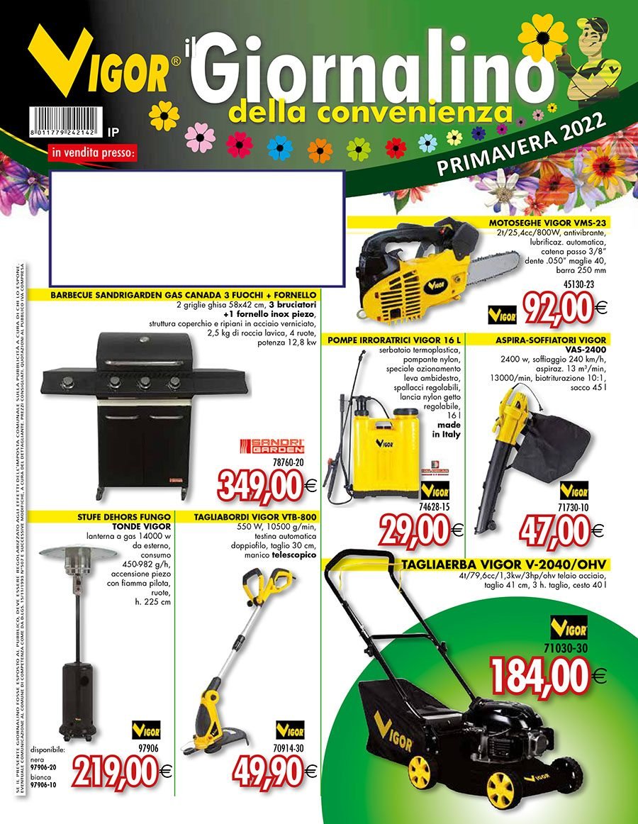 BUSSOLENO āĀ In questi giorni Edil BussolenoĀ presenta il nuovo Giornalino della ConvenienzaĀ con tanti prodotti e promozioni di primavera. Per chi ha un orto, un giardino o uno spazio esterno da curare vi ĆØ unāampia scelta di macchinari, attrezzi e materiale di consumo, dai tagliaerba alle motoseghe, dalle recinzioni alle serre, dalle fioriere alle cesoie per potare, dal materiale per lāirrigazione alle elettropompe. Per vivere la bella stagione allāaria aperta ĆØ possibile trovare i barbecue, le graticole e gli accendifuoco, le amache, le sedie da campeggio e a sdraio, i lettini prendisole, i tavoli, lāarredo da giardino, i gazebo, gli ombrelloni e le tende da sole. Per difendersi dagli animali molesti molti sono gli scacciatopi, roditori, cani e volatili. Chi si appresta ai lavori di verniciatura sul Giornalino della Convenienza ĆØ possibile trovare levigatrici per persiane, rulli, pennelli, miscelatori e trabattelli, pistole a spruzzo. Poi lāabbigliamento da lavoro, guanti, occhiali, impermeabili, ombrelli, cappelli, mascherine, visiere, calzature. Infine unāampia vetrina di utili oggetti: guinzagli per cani, bottiglie in acciaio, scaldavivande, cinghie e corde elastiche, pompe per biciclette, caricabatterie, verricelli, paranchi, cricchi, compressori e molti prodotti per lāhobbistica e il fai da te. Scopri il nuovo Giornalino della Convenienza da Edil Bussoleno: il team sa sempre consigliarti al meglio!