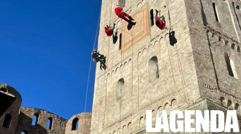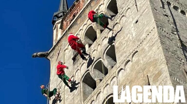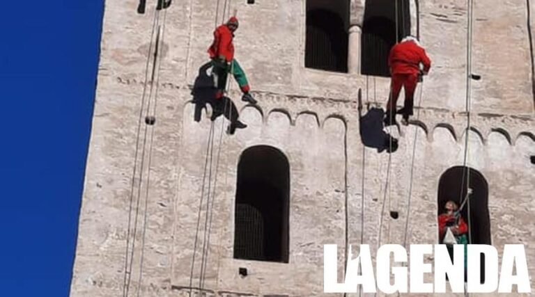 SUSA – A Susa Babbo Natale, con un suo fidato Elfo, è sceso dal campanile della Chiesa di San Giusto. Sempre più Natale a Susa con un calendario di iniziative ed eventi davvero ricco. In questo caso sono stati tre i Babbo Natale a calarsi per la gioia di piccoli e grandi. Un’iniziativa salutata con calore dal sindaco Piero Genovese. Parliamo del campanile. E’ alto 51 metri ed è dell’XI secolo, con aggiunte del XV secolo. La cuspide, voluta dal cardinale Guillaume d’Estouteville, e guglie e del XVIII secolo basamento di rinforzo. Esso presenta, sulle quattro facciate, sei ordini: i tre inferiori con monofore, i tre superiori con, dal basso, bifore, trifore e quadrifore. Sulla destra della cattedrale, vi è la Porta Savoia, porta romana del IV secolo con due torri circolari.
