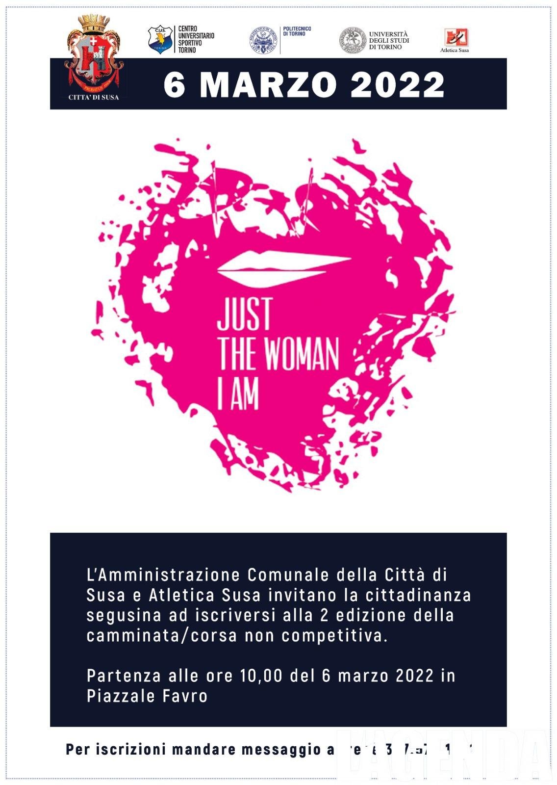 Paolo Germanetto Presidente Atletica Susa: ācome lo scorso anno la camminata si svolgerĆ sul percorso della StraSusa, appuntamento Domenica 6 marzo, alle ore 10,00 La donazione per lāiscrizione ĆØ di 20 euro a persona e comprende la maglietta, la welcome bag, il pettorale personalizzato fino a esaurimento scorte. Per iscrizioni segusine invitiamo a telefonare o mandare unĀ messaggio a Irene Bologna al nr 347.572.1991 ā. Just the Woman I Am ĆØ una festa per celebrare le donne; una festa per promuovere uno stile di vita sano; una festa per favorire lāinclusione e la condivisione anche a Susa.