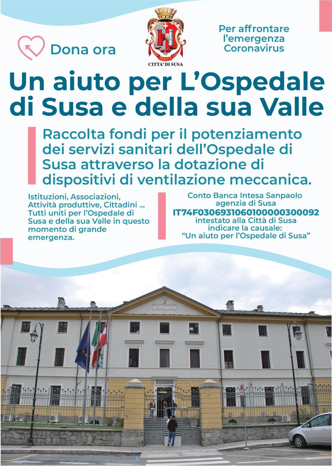 SUSA – L’Amministrazione Comunale di Susa lancia una grande mobilitazione della valle per il suo Ospedale. La Città di Susa dà il via all’operazione “Un aiuto per l’ospedale di Susa e della sua Valle”. Dal Comune parte con una grande mobilitazione per affrontare l’emergenza Coronavirus. Coinvolgendo Istituzioni, Associazioni, Attività produttive, Cittadini di tutta la Valle di Susa. Facendo un appello di grande Unità per aiutare l’ospedale di Susa e della sua Valle in questo momento di grande emergenza. La raccolta fondi per il potenziamento dei servizi sanitari dell’Ospedale di Susa. Ha come obiettivo la dotazione di dispositivi di ventilazione meccanica e sarà possibile inviando un bonifico.