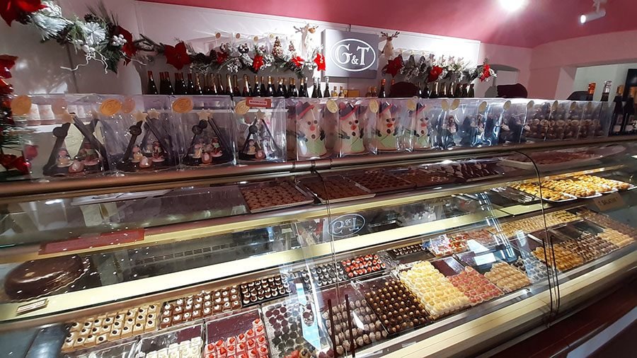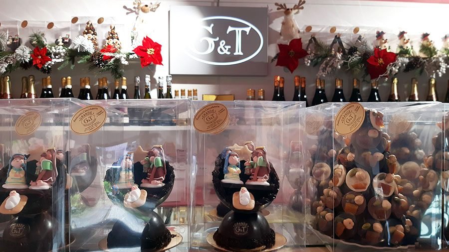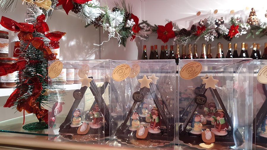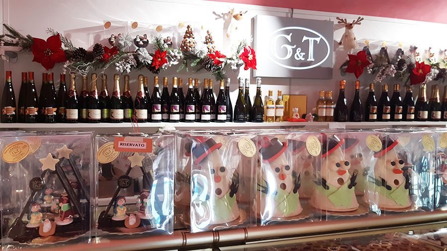 Alla Pasticceria Grande di Condove non potevano mancare gli imperdibili Condovesi al Rhum o alla nocciola elegantemente incartati a uno a uno, sono anche gli addobbi di dolcissimi alberi di Natale. Giorgio Grande è un vero maestro nell’arte della lavorazione del cioccolato che questo Natale trionfa in tutte le sue forme. Infatti nel laboratorio climatizzato per la produzione del cioccolato nascono ogni giorno le sue preziose creazioni. Sul banco perfettamente allineati e rigorosamente di cioccolato scorgiamo i pupazzi di neve, i presepi e gli alberelli di Natale. Un’idea originale, un’opera d’arte da condividere in compagnia o da regalare a chi si vuol bene. Magari accompagnati dai vini pregiati presenti in pasticceria.