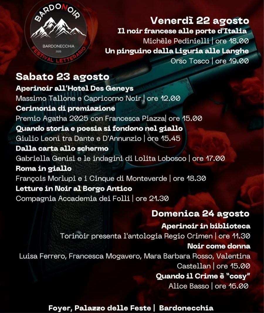 BARDONECCHIA – Torna anche quest’anno a Bardonecchia il Festival Bardonoir, giunto alla terza edizione. Attesi autori nazionali ed anche, per la prima volta da oltralpe. Tra loro Gabriella Genisi, creatrice di Lolita Lobosco e la francese Michele Pedinielli, tradotta di recente in Italia. Il Premio Agatha 2025, organizzato dalla rivista Agatha in collaborazione con Golem Edizioni, sarà assegnato alle autrici dei tre migliori racconti noir, ambientati in terre di montagna o di frontiera. Bardonoir arriva alla sua terza edizione e si può dire che il Festival noir di Bardonecchia sia ormai una rassegna consolidata. Nato come evento locale, sta assumendo rilevanza al di fuori della Val Susa e del Piemonte, anche grazie al coinvolgimento di scrittori di livello nazionale.