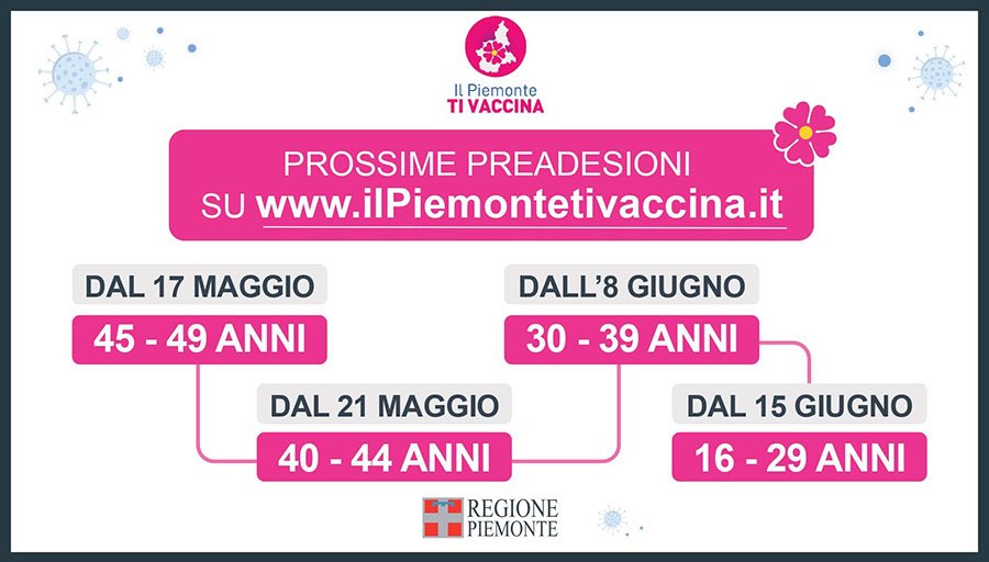 La campagna di vaccinazioni contro il Covid-19 dellaĀ Regione PiemonteĀ ĆØ iniziata lunedƬ 15 febbraio. Prima hanno avuto accesso le persone con più di 80 anni. Poi anche il personale docente e non docente delle scuole e delle UniversitĆ . Inoltre i volontari della Protezione Civile hanno potuto esprimere la volontĆ di farsi vaccinare. LunedƬ 29 marzo ĆØ partita la vaccinazione degli over 70, a cominciare dalla fascia 75-79 anni come previsto dal piano nazionale. Questa importante fase vede il supporto operativo dei medici di famiglia per le somministrazioni e di Federfarma Piemonte per la distribuzione presso le farmacie del territorio. Lā8 aprile sono partite le preadesioni per la fascia 60-69 anni. Dal 26 aprile sono partite le preadesioni alle vaccinazioni dei soggetti fragili tra 16 e 59 anni con esenzione per patologia. Dal 4 maggio ĆØ possibile la preadesione per la fascia 55-59 anni. Dallā11 maggio ĆØ partita la preadesione sul portale per la fascia 50-54 anni. Ć possibile utilizzare e consultare lāapposito portaleĀ www.ilpiemontetivaccina.itĀ dedicato allāadesione alle vaccinazioni.