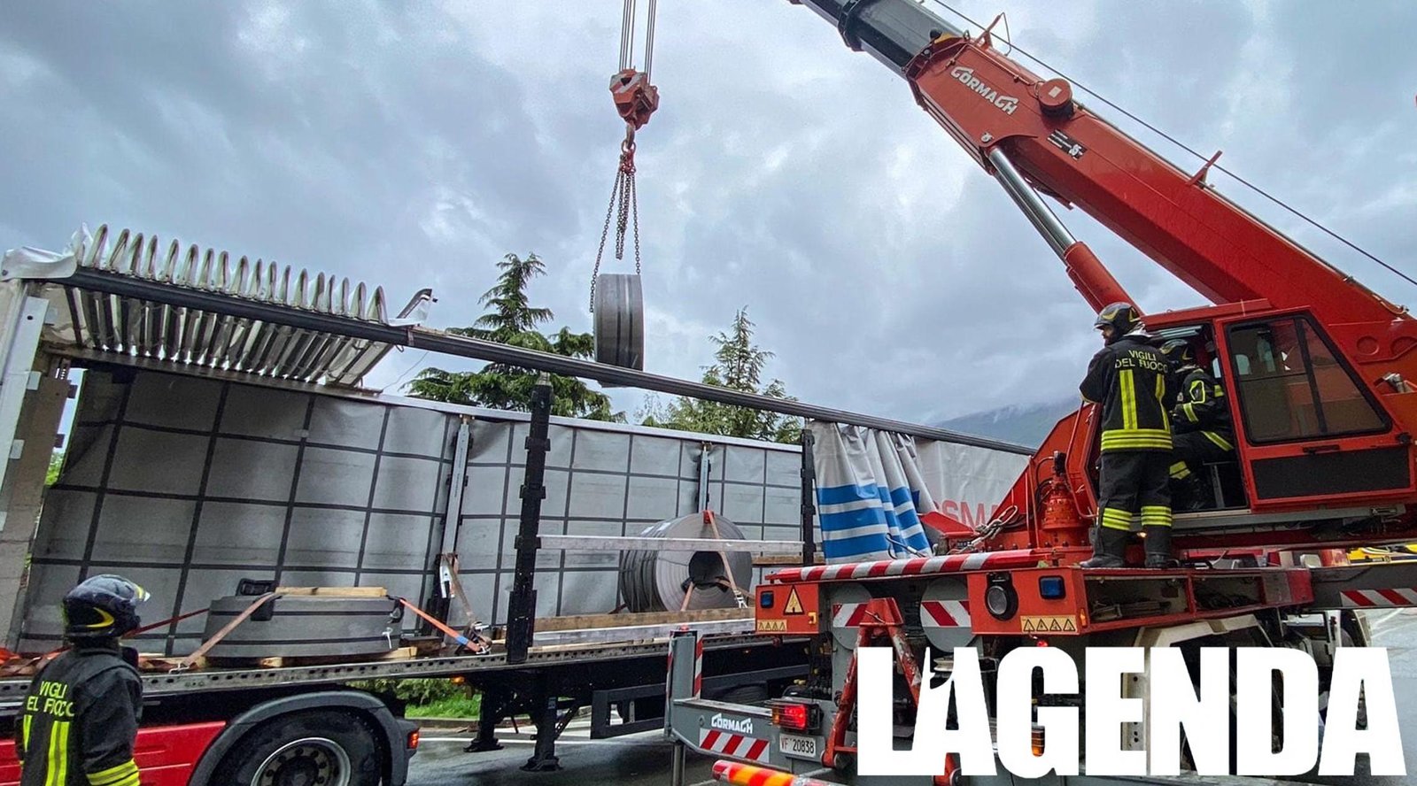 BORGONE – I Vigili del Fuoco con l’autogru stanno recuperando le bobine rotolate in strada a Borgone questa mattina. Il mezzo pesante ha perso inavvertitamente dal proprio carico due grosse bobine da 4 tonnellate ciascuna. Queste sono ruzzolate in strada. E’ successo stamattina, giovedì 5 maggio, intorno alle 10 alla rotonda in cui si intersecano la Statale 25 e l’ex Statale 24. A causare la perdita del carico, dal lato destro del mezzo, sono stati probabilmente la leggera pendenza della rotonda e il fatto che verosimilmente le due bobine non fossero ben ancorate all’interno del rimorchio.