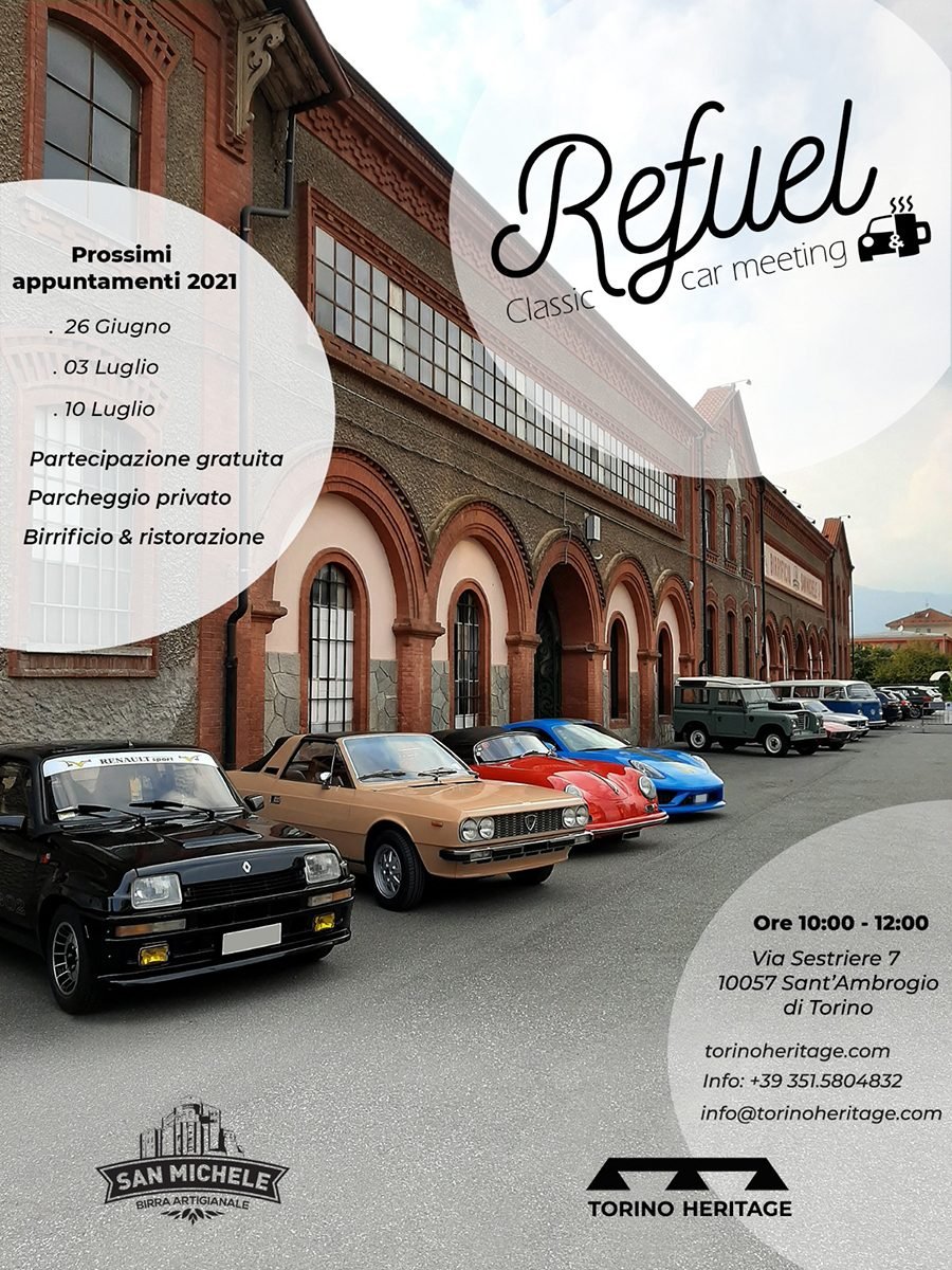 L’evento “Refuel Classic Car Meeting” è in Via Sestriere, 7 a Sant’Ambrogio di Torino in Valsusa. La sede è lungo la Statale SS25 a solo 4 km dall’uscita Avigliana Ovest – Autostrada A32. Anche raggiungibile dalla stazione ferroviaria di Porta Nuova a Torino in soli 30 minuti di treno. Per informazioni è possibile contattare il numero telefonico 351 5804832 oppure scrivere alla e-mail info@torinoheritage.com. Vi invitiamo a visitare il sito dell’Associazione Torino Heritage al link.