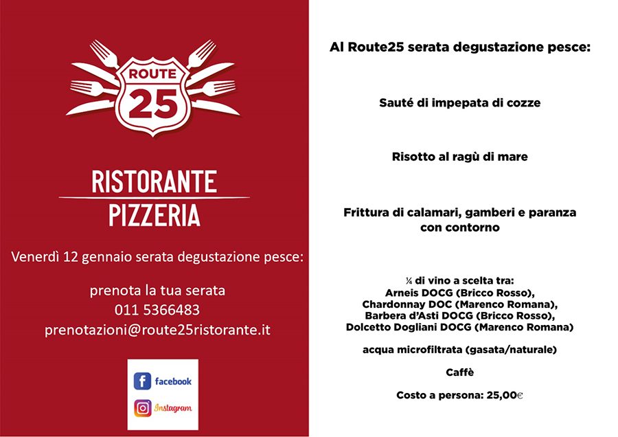AVIGLIANA – Il Ristorante Pizzeria Route 25 di Avigliana inaugura il nuovo anno con la serata degustazione pesce venerdì 12 gennaio. Rimanete sintonizzati per scoprire i prossimi imperdibili appuntamenti. Affrettatevi a prenotare il vostro tavolo al numero telefonico 011 5366483 oppure al LINK.