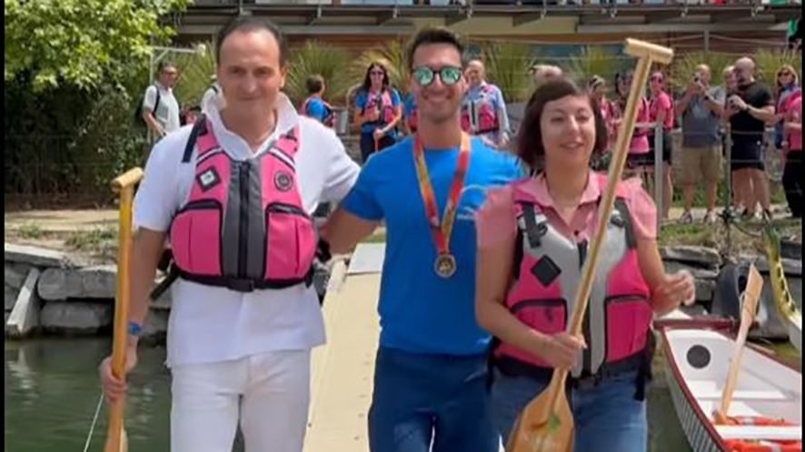AVIGLIANA – Il Presidente della Regione Piemonte Alberto Cirio ha visitato sabato 26 luglio il Lago di Avigliana per complimentarsi e congratularsi con le Dragonesse di Avigliana, recenti campionesse del mondo per l’Italia nella finale dei 200 metri. Durante l’evento celebrativo, il governatore piemontese ha avuto l’opportunitĆ di pagaiare insieme alle atlete, condividendo un momento simbolico che ha sottolineato l’importanza dello sport come strumento di rinascita e speranza. Queste donne rappresentano chi ha vinto non solo una dura battaglia contro il tumore al seno, ma sono la testimonianza che ci si può rialzare subito dopo una malattia dimostrando con la loro medaglia d’oro mondiale il valore della determinazione e del coraggio.