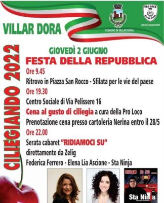 VILLAR DORA – Ritorna dopo due anni di stop dovuto all’emergenza Covid la Festa Ciliegiando a Villar Dora. La manifestazione si svolgerĆ in concomitanza alla Festa del 2 Giugno. Il programma prevede il ritrovo in Piazza San Rocco alle 9,45 e la sfilata per le vie del paese verso i monumenti cittadini. Poi la sera alle 19,30 presso il Centro di Via Pelissere la Cena al gusto di ciliegia a cura della Pro Loco con la prenotazione presso la Cartoleria Nerina entro il 28 maggio. Dalle 22 una serata cabaret con “Ridiamoci su” direttamente da Zelig con Federica Ferrero, Eena Lia Ascione e Sta Ninja.