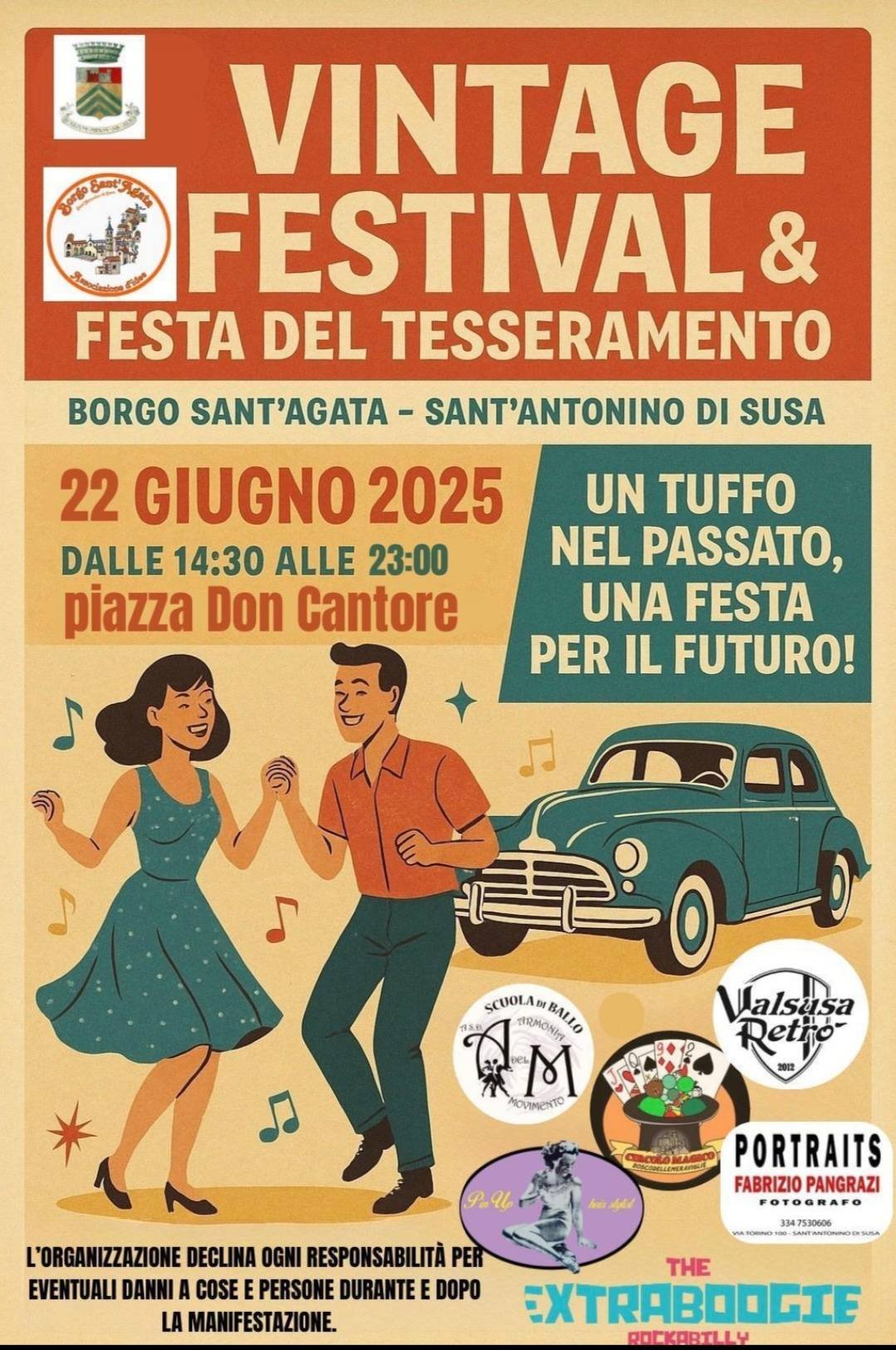 SANT’ANTONINO DI SUSA – Domenica 22 giugno, dalle 14.30 alle 23.00, Piazza Don Cantore a Sant’Antonino si trasformerà in un angolo senza tempo grazie al Vintage Festival, l’evento imperdibile organizzato dall’Associazione Borgo Sant’Agata. Un’intera giornata dedicata alla magia del retrò, pensata per far divertire adulti e bambini con atmosfere uniche, attività coinvolgenti e tanti momenti da ricordare. Potrai scattare eleganti ritratti in bianco e nero nell’Angolo delle Fotografie, scoprire oggetti curiosi e utili al Swap Party, lasciarti affascinare dal fascino delle Pin-Up e rimanere stupito dalla Magia che animerà la piazza. Il tutto sarà accompagnato da arrosticini deliziosi e da un’accogliente Area Relax dove godersi una pausa in compagnia.