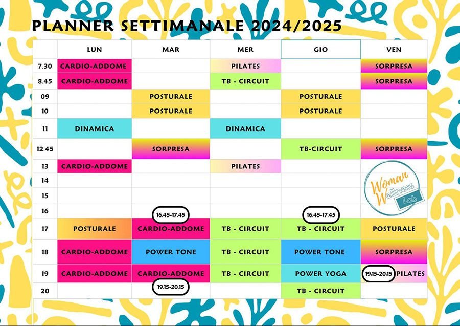 - Pilates. Potenziamento del core, stabilizzazione della colonna vertebrale e miglioramento della postura attraverso esercizi controllati e precisi.